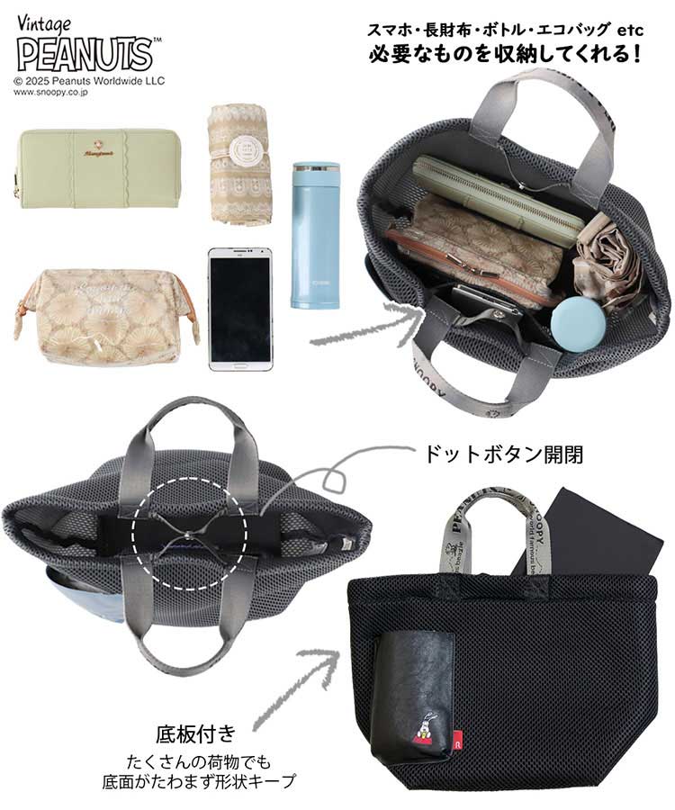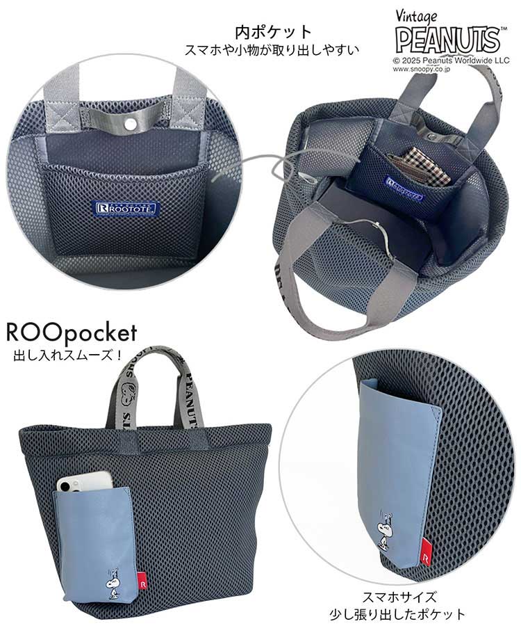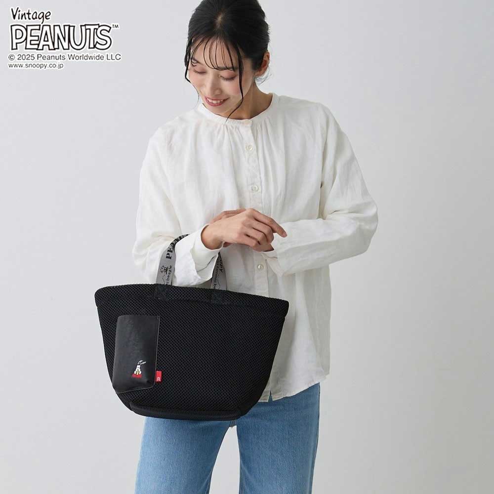 ふわっと軽やかで、通気性の良いメッシュ素材を使ったシリーズです。サラリとした手触りは暑い季節にもベタつかず、快適。本体は、普段使いしやすいベーシックカラー。スヌーピーの刺繍を施した合皮のルーポケットがアクセント。立体感のあるルーポケットは、出し入れスムーズ。スマホなどサッと取り出したいモノの収納に便利です。
