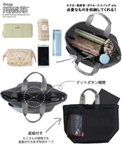 普段使いにちょうどよいサイズ。お財布、ボトル、A5ノート、ポーチなどらくらく収納。底板付きで、モノを入れてもたわまず、しっかり安定して収納できます。ドットボタン開閉で、中身を隠せて安心です。いつでも清潔に。手洗い可能(手おし洗い推奨)で、衛生的に安心してご利用いただけます。汗ばむ季節のデイリー使用にもお奨め。