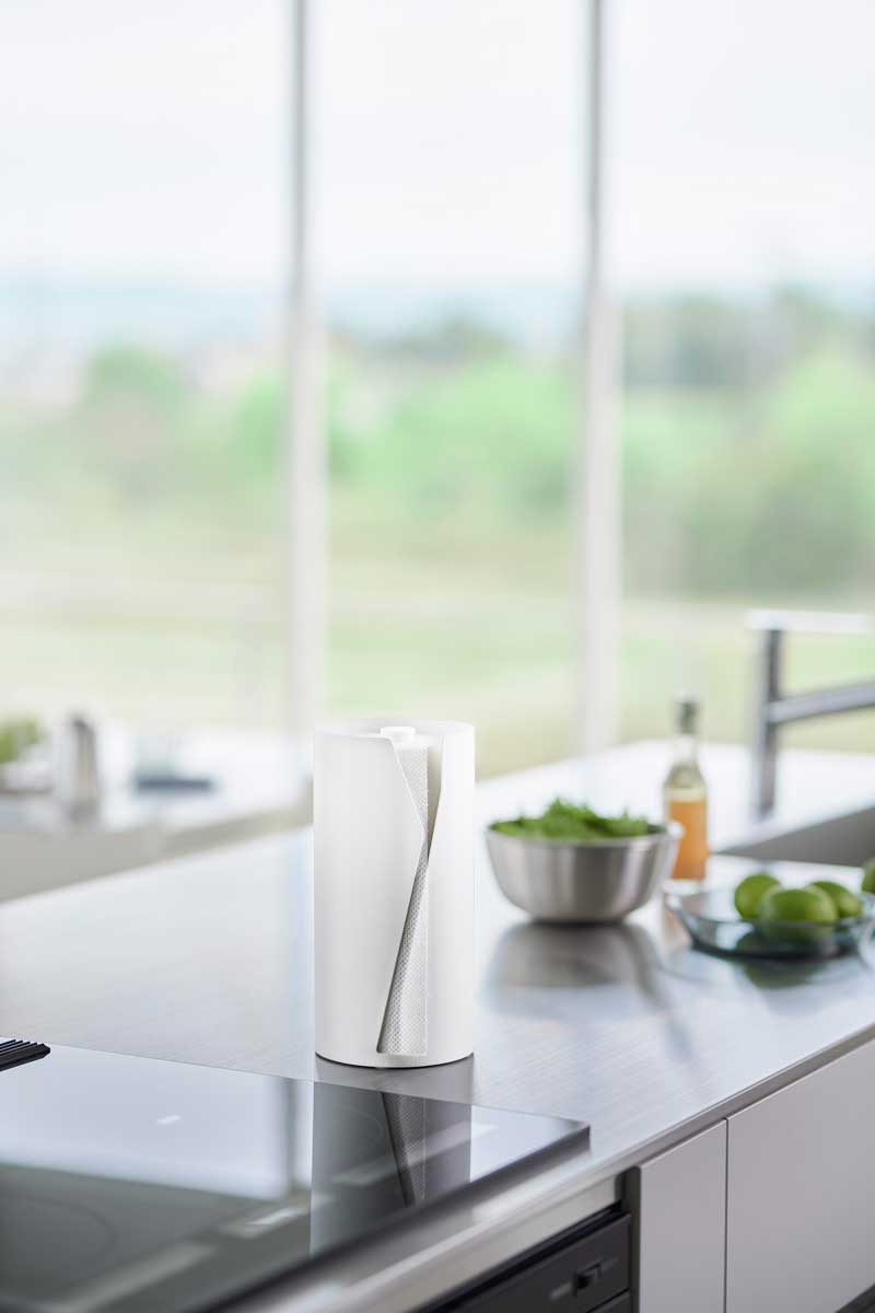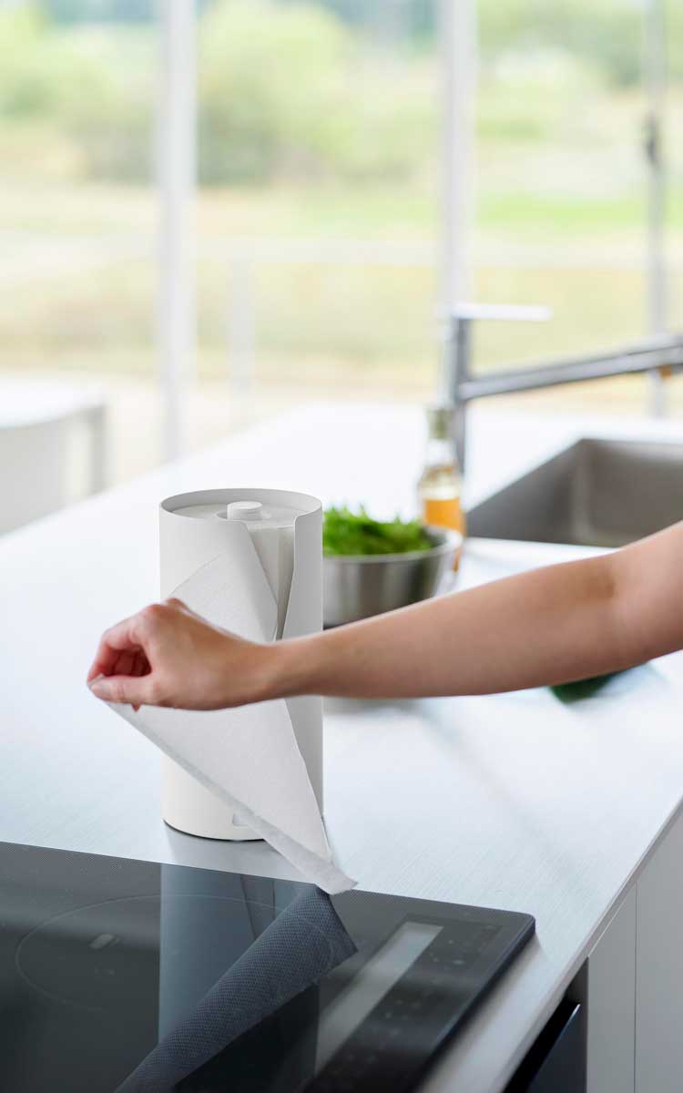 縦置きで省スペース設計のキッチンペーパーホルダーです。国内で販売されている一般的なサイズのキッチンペーパーを収納できます。安定感のある構造で片手でもスムーズに引き出せ、特殊な形状のスリットはペーパーを簡単にカットすることができます。