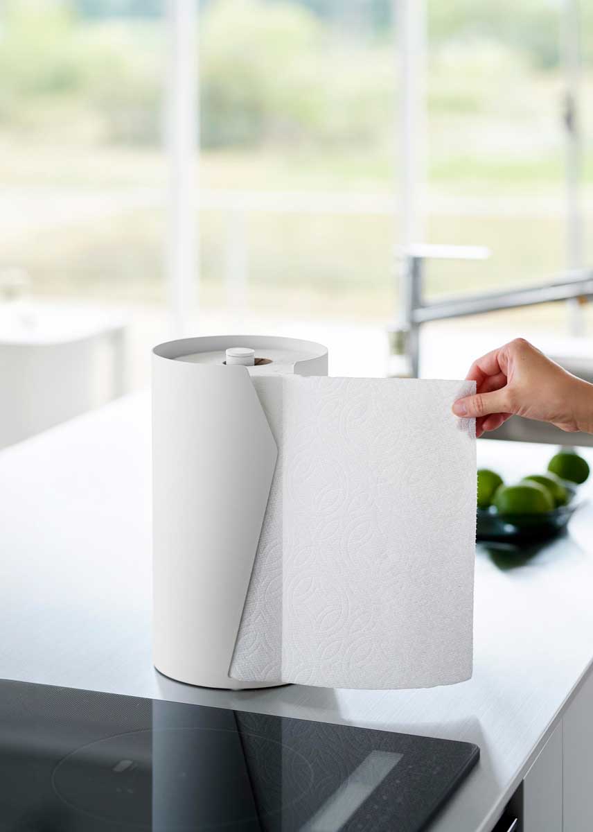 縦置きで省スペース設計のキッチンペーパーホルダーです。海外製の大判タイプのキッチンペーパーを収納できます。安定感のある構造で片手でもスムーズに引き出せ、特殊な形状のスリットはペーパーを簡単にカットすることができます。