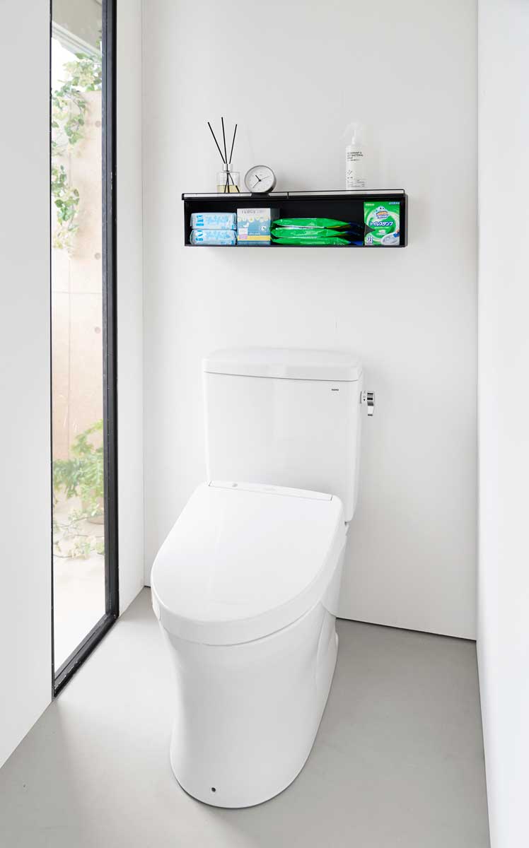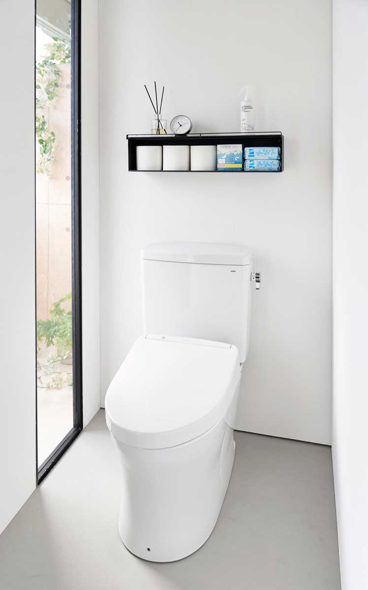 幅60cmのワイドサイズで、トイレットペーパーやサニタリーなどのストックをスッキリ隠して大容量収納できます。扉は開閉がスムーズなフラップ式で、天板は小物置きとしても活用できます。