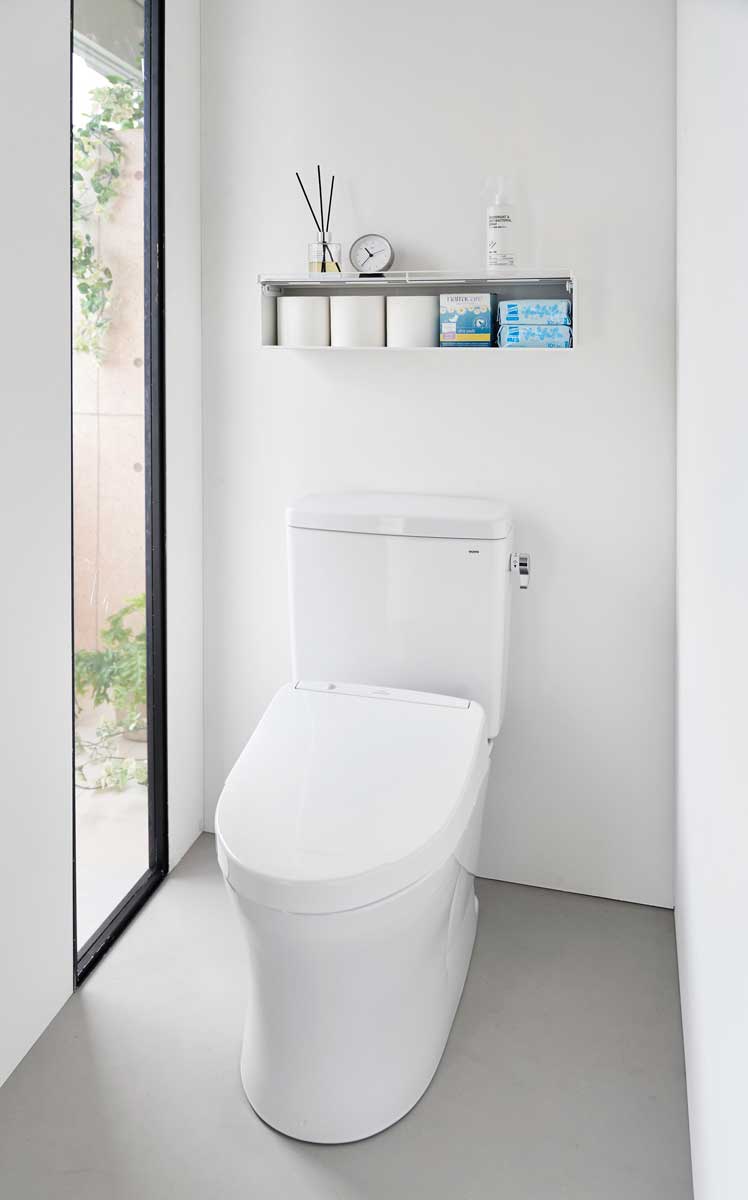 幅60cmのワイドサイズで、トイレットペーパーやサニタリーなどのストックをスッキリ隠して大容量収納できます。扉は開閉がスムーズなフラップ式で、天板は小物置きとしても活用できます。