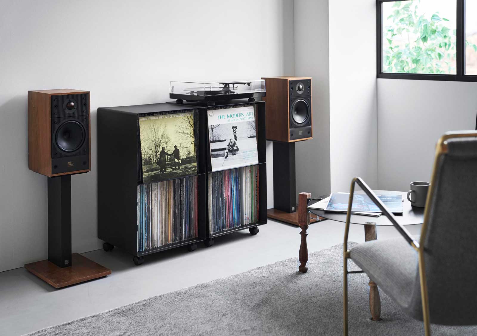 天板には幅38x奥行き38cmまでのレコードプレーヤーを設置できます。スチール製の側面には、別売りのマグネット収納が取り付け可能なので、お手入れアイテムの収納場所として活用できて便利です。