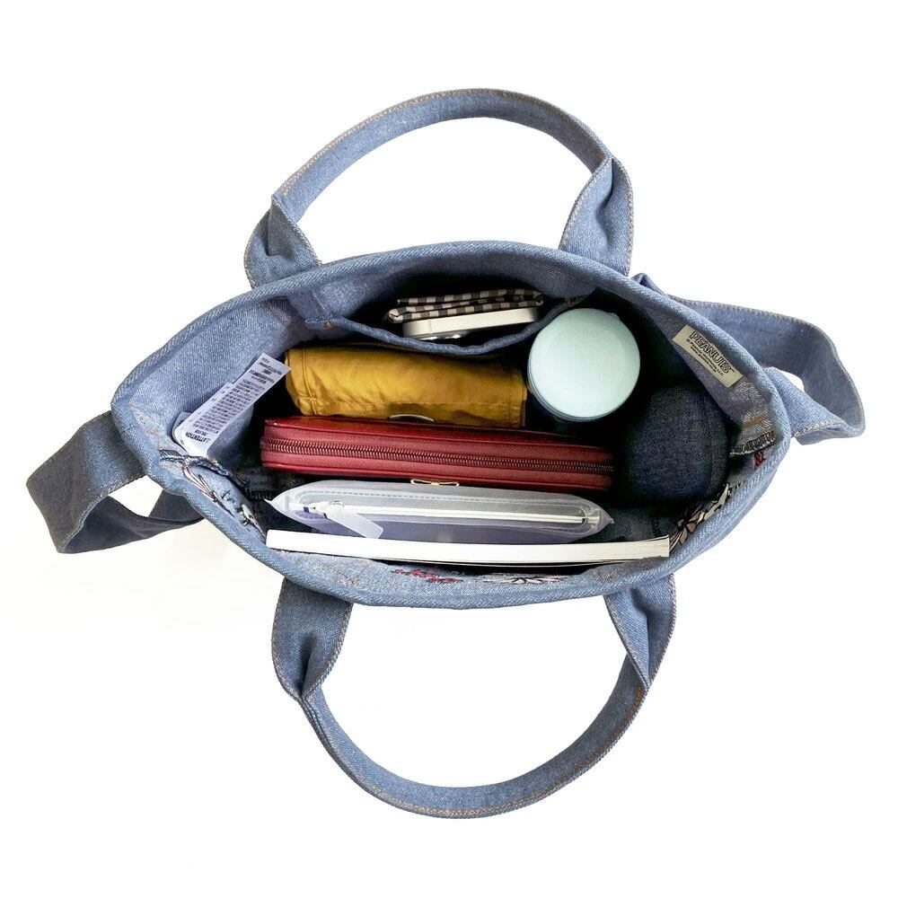 オトナも楽しんでいただけるこだわりのデザイン。表情豊かなスヌーピーと仲間たちを、カラフルな刺繍で表現。縦糸と横糸の色を変えることで、デニムの風合いに仕立てたリサイクルコットン生地を使用。背面のルーポケットは、すぐに取り出したい小物の収納に便利です。広めの底マチで、見た目以上にたっぷり収納可能。