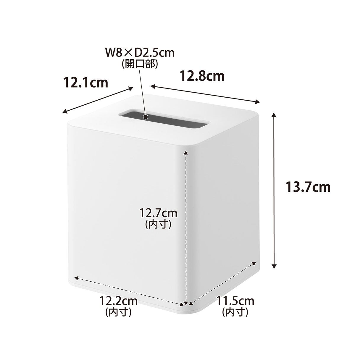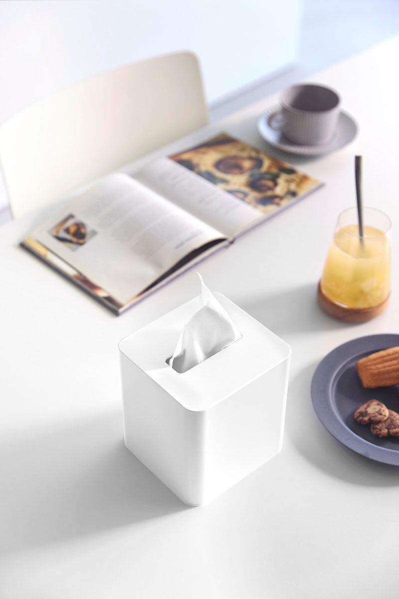詰め替え用のティッシュケース。1箱分のティッシュを半分のスペースに収納できる、スクエア型のティッシュケースです。洗面所やテーブル上など、スペースが不足しがちな場所にも置きやすく、空間を有効活用できます。