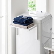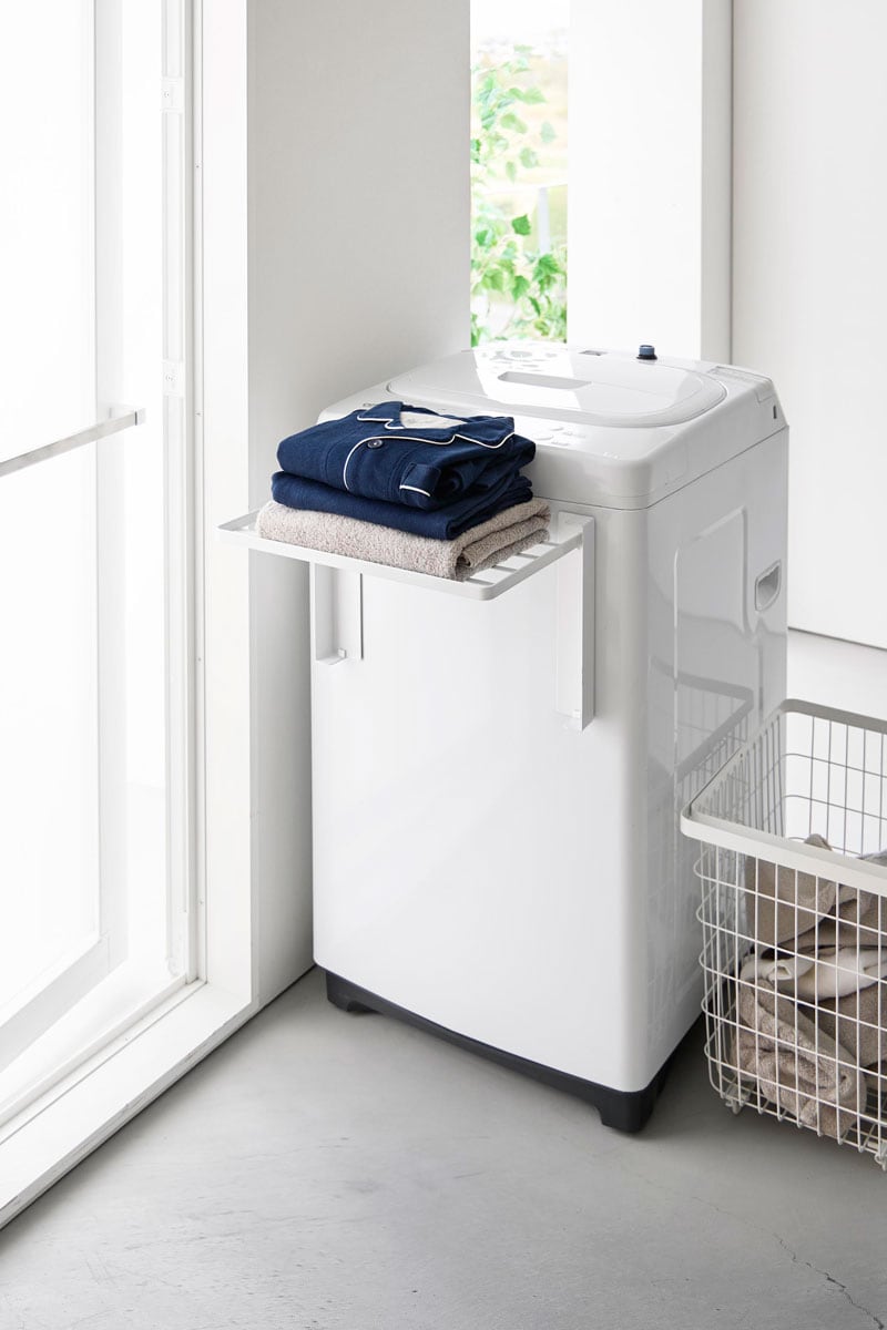 マグネットで洗濯機の正面や側面に簡単取り付けでき、使いやすい高さで調節して設置できる折り畳み棚です。取り付け部分が可動式なので、接地する面が曲面になっていても取り付けできます。
