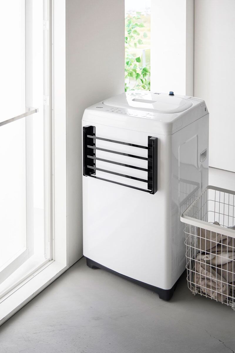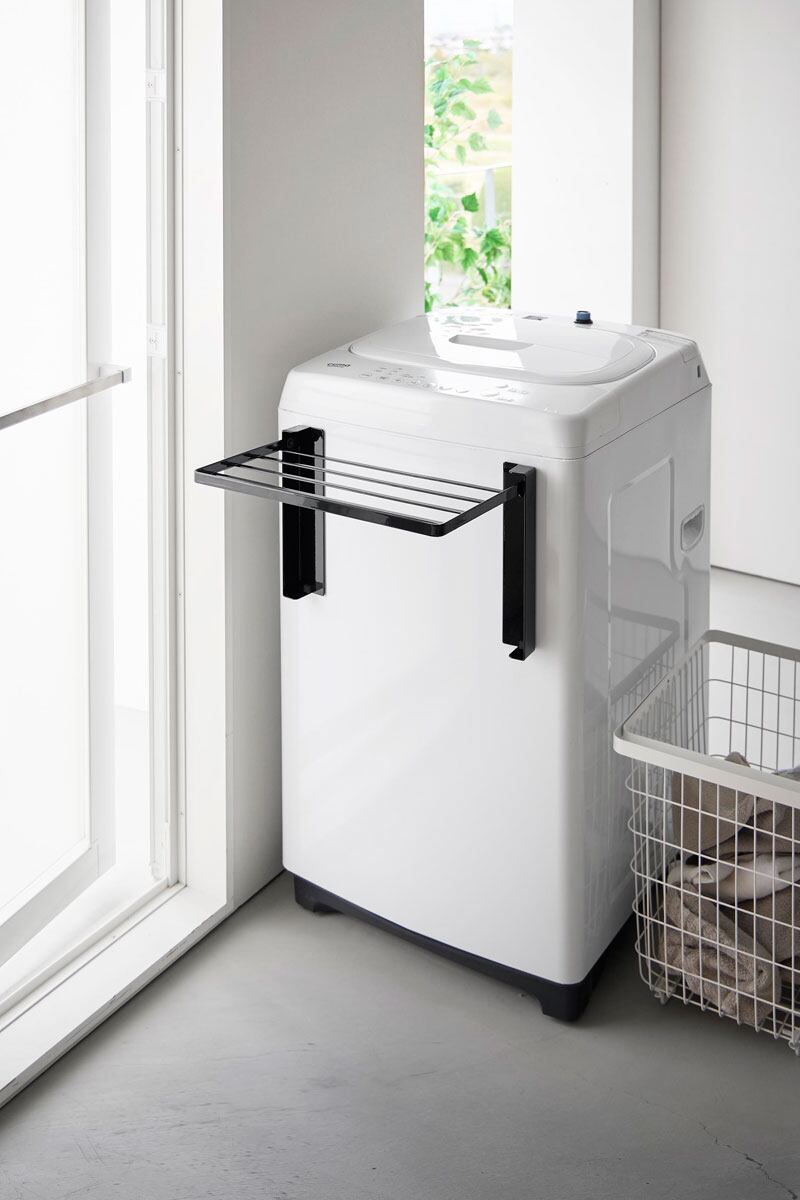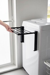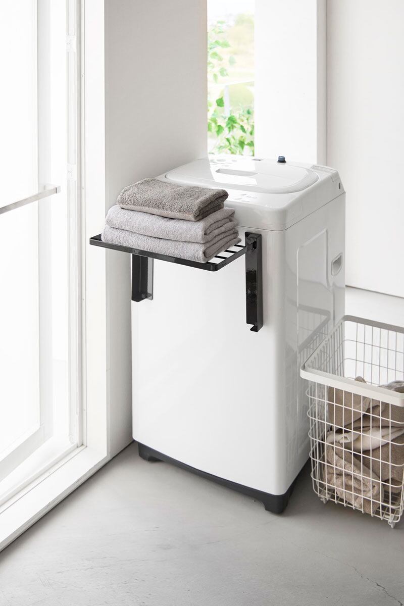 マグネットで洗濯機の正面や側面に簡単取り付けでき、使いやすい高さで調節して設置できる折り畳み棚です。取り付け部分が可動式なので、接地する面が曲面になっていても取り付けできます。