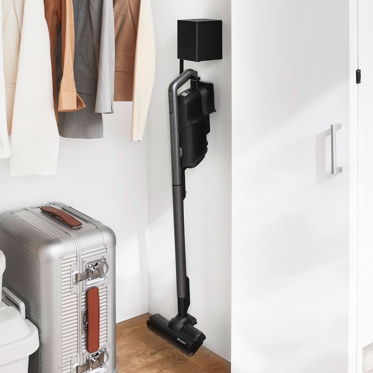 コードレスクリーナーを浮かせて収納できるコンパクトなホルダーです。紙パックも一緒に収納することができ、交換やストック管理に便利。クローゼット内に設置して、小物収納としての使用もおすすめです。