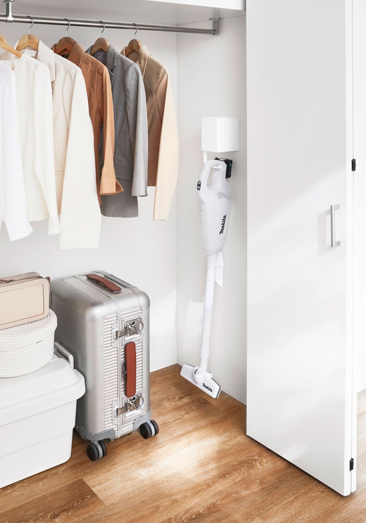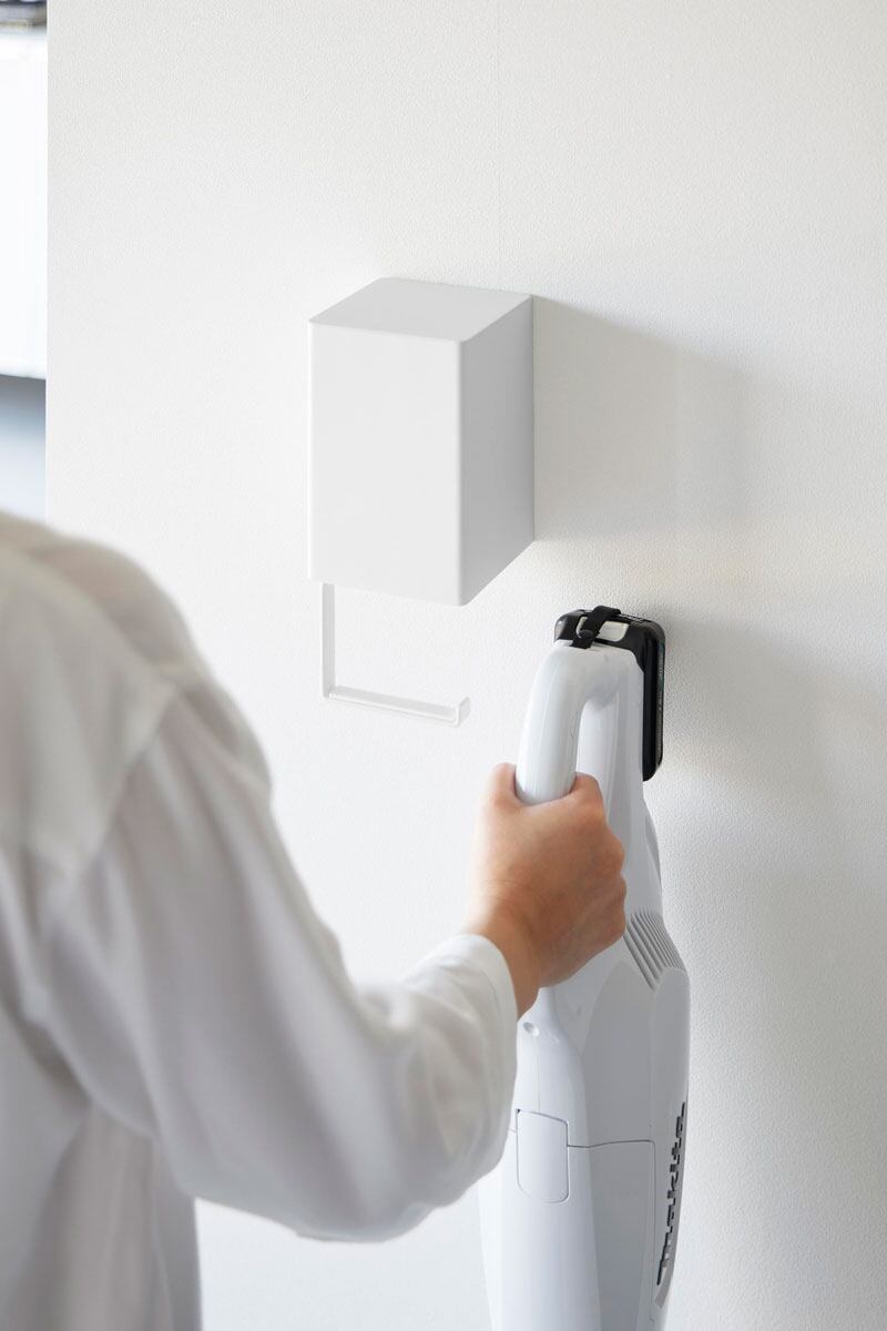 コードレスクリーナーを浮かせて収納できるコンパクトなホルダーです。紙パックも一緒に収納することができ、交換やストック管理に便利。クローゼット内に設置して、小物収納としての使用もおすすめです。