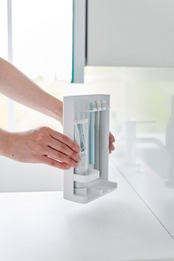 サッと裏返すだけで隠したい時にすぐに隠せる、シンプルなデザインの歯ブラシ&チューブスタンドは、歯ブラシ3本と歯磨き粉チューブ1本を簡単に収納できます。