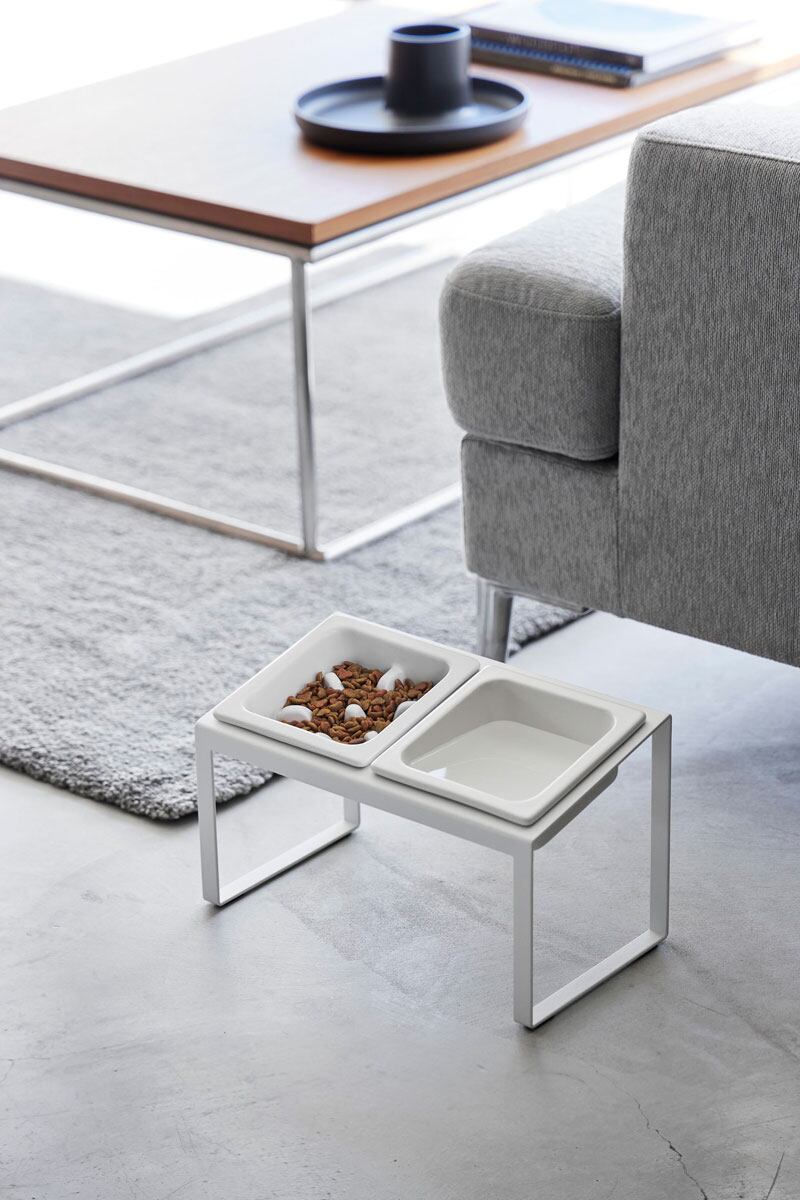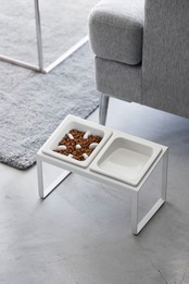 ボウルの位置が高く傾斜つきで食べやすい設計で、早食い防止ボウルとボウルがセットになったペットフードボウルスタンドです。フードとお水、または2種類のフードなど自由に使い分けて並べて置けて便利です。
