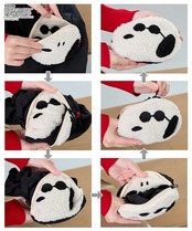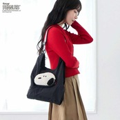 取り外し&長さ調整可能な、両面プリントのショルダーベルト付き。シーンに合わせて、手持ち・肩掛け・斜め掛けと使い分けができます。真ん中のおすましフェイスのポケットがかわいく、使わないときは、このポケットをひっくり返してショッパー本体を収納すれば、違う表情のスヌーピーに大変身。