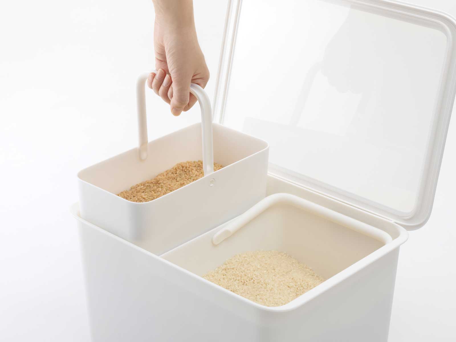 お米をすっきり効率的に収納するケースです。ケース単体でも、インナーで内側を仕切っても使える米びつ。白米と雑穀米、白米とレトルト食品などを分けて保存可能。シリアルとコーヒーといった朝食セットやペット用のドライフード・缶詰などの収納にも便利です。本体に卵殻由来の天然抗菌剤を配合。雑菌の発生を抑制する効果があり、食品も安心して保存いただけます。