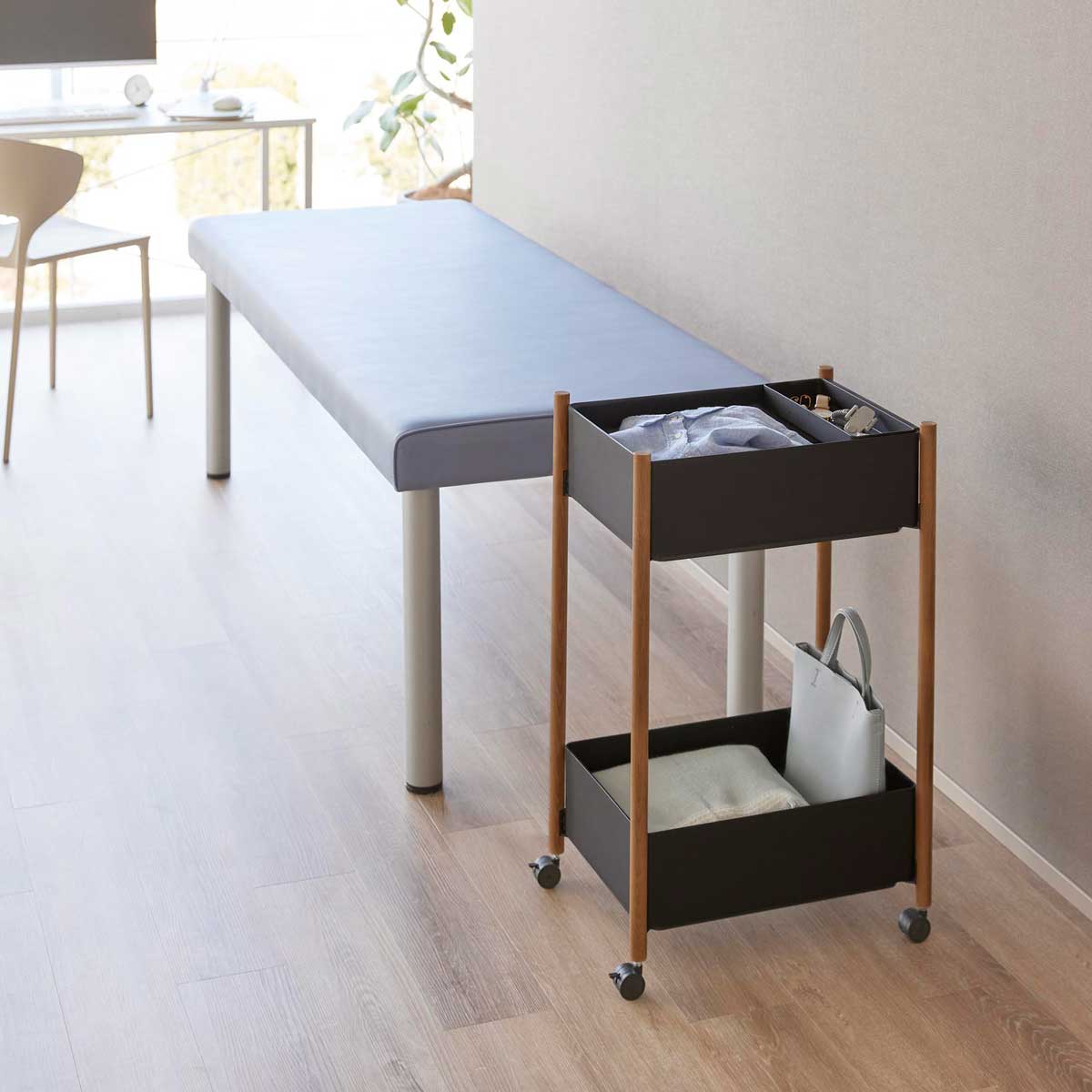 病院やエステサロンなどで便利に使える小物トレー付き収納ワゴンです。キャスター付きでスムーズに移動でき、コンパクトサイズなので、診察室やカウンター周りにもスッキリと設置できます。