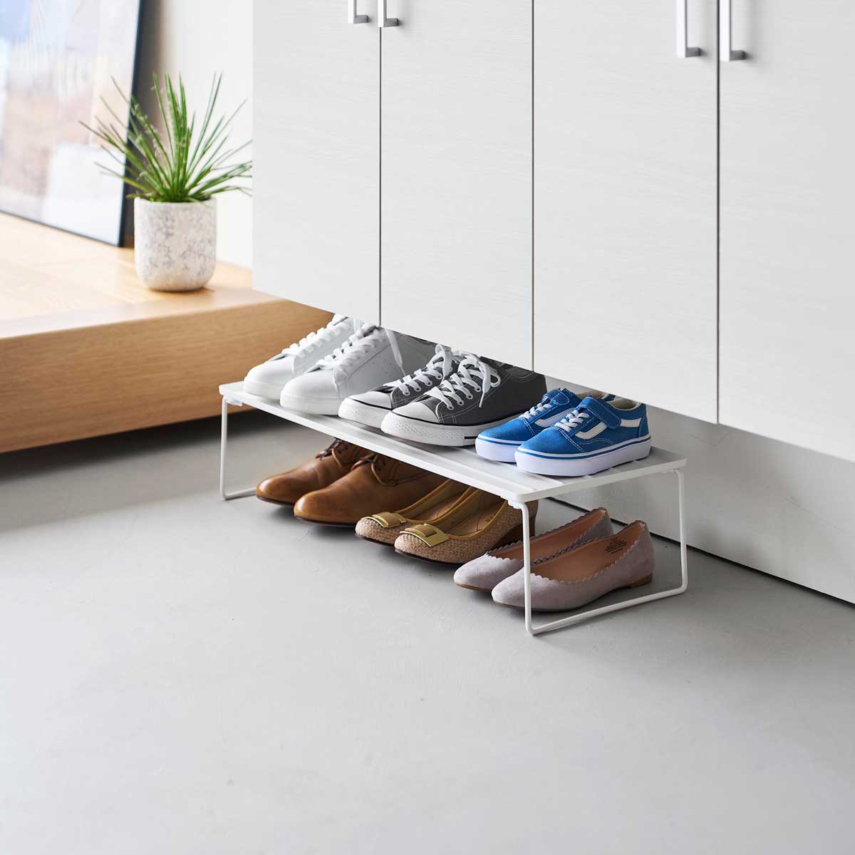 下駄箱下の空いているスペースを活用して靴の収納場所を増やしたり、スペースに合わせてラックをスタッキングして使用できます。丈夫なスチール製なので、シューケア用品なども靴と一緒に置けて便利です。
