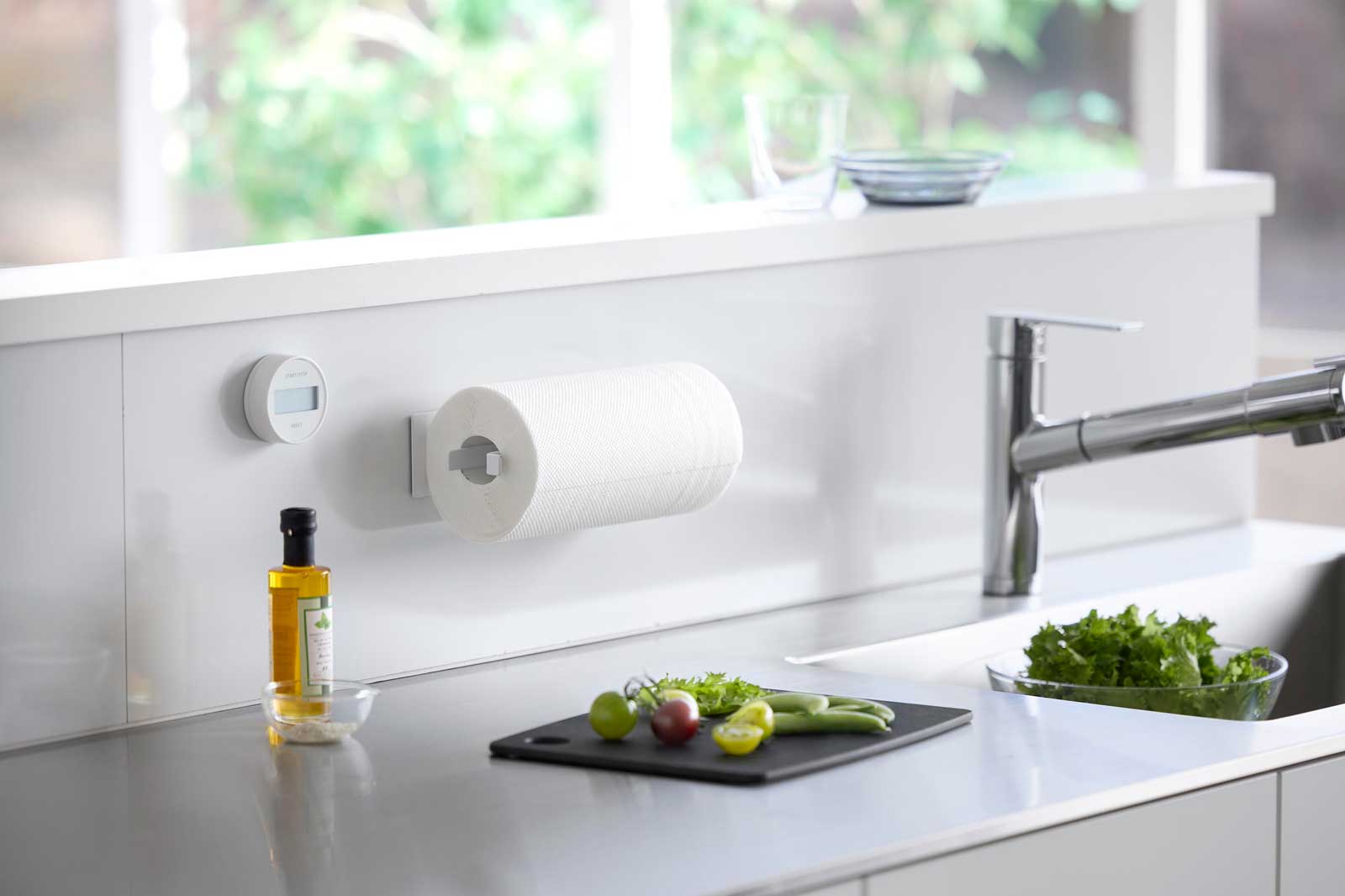 シリコーン製のストッパーがキッチンペーパーロールをしっかりキャッチし、片手でスムーズにカットできます。キッチンパネルに設置すれば、野菜の水切りや台拭き、油汚れなどの拭き掃除の際にも便利。