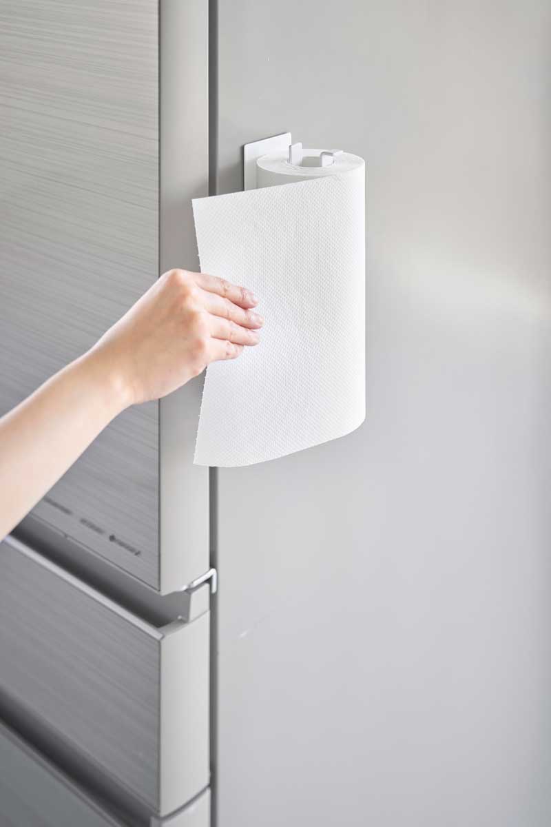 マグネットで簡単取り付けでき、縦と横どちらの向きでも使用可能。ホルダーにキッチンペーパーロールを差し込むだけで使えるシンプルな構造のホルダーです。