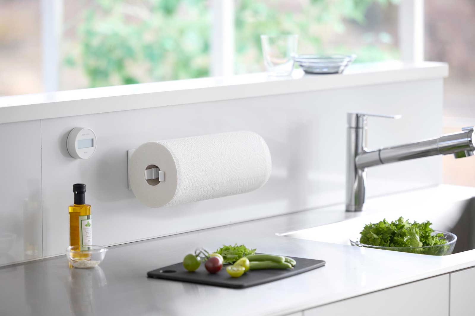 シリコーン製のストッパーがキッチンペーパーロールをしっかりキャッチし、片手でスムーズにカットできます。キッチンパネルに設置すれば、野菜の水切りや台拭き、油汚れなどの拭き掃除の際にも便利。