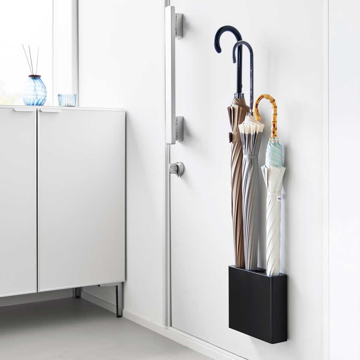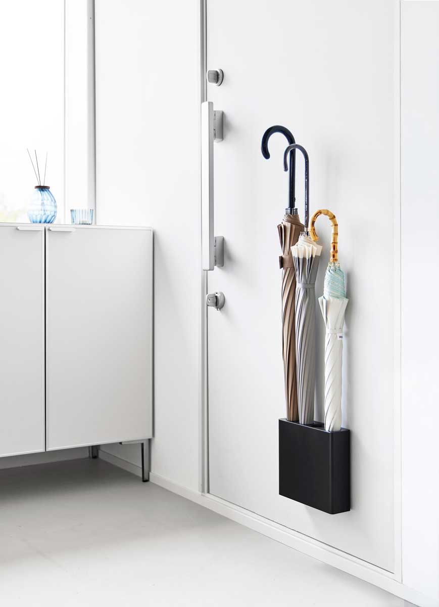 玄関ドアが傘の収納スペースになるアンブレラホルダー。奥行きが約63mmのスリム形状で圧迫感なく設置できます。傘をしっかりホールド、ドア開閉時に傘が落ちることなく安定して収納できます。