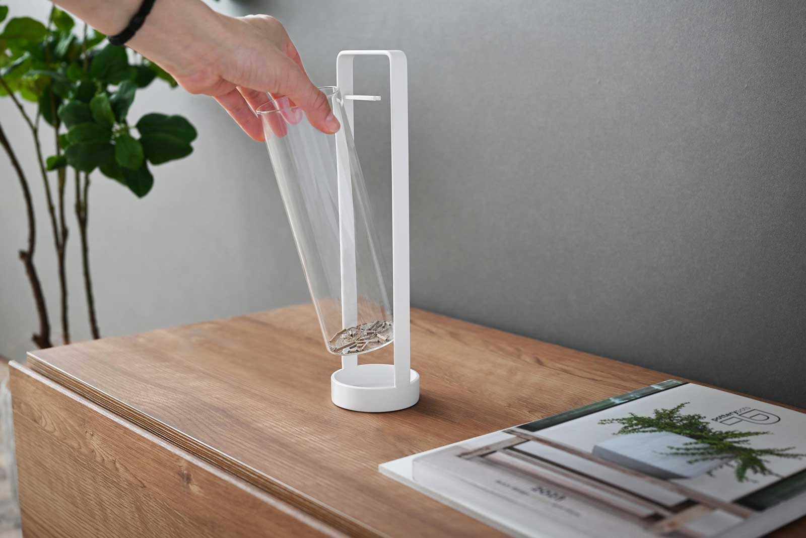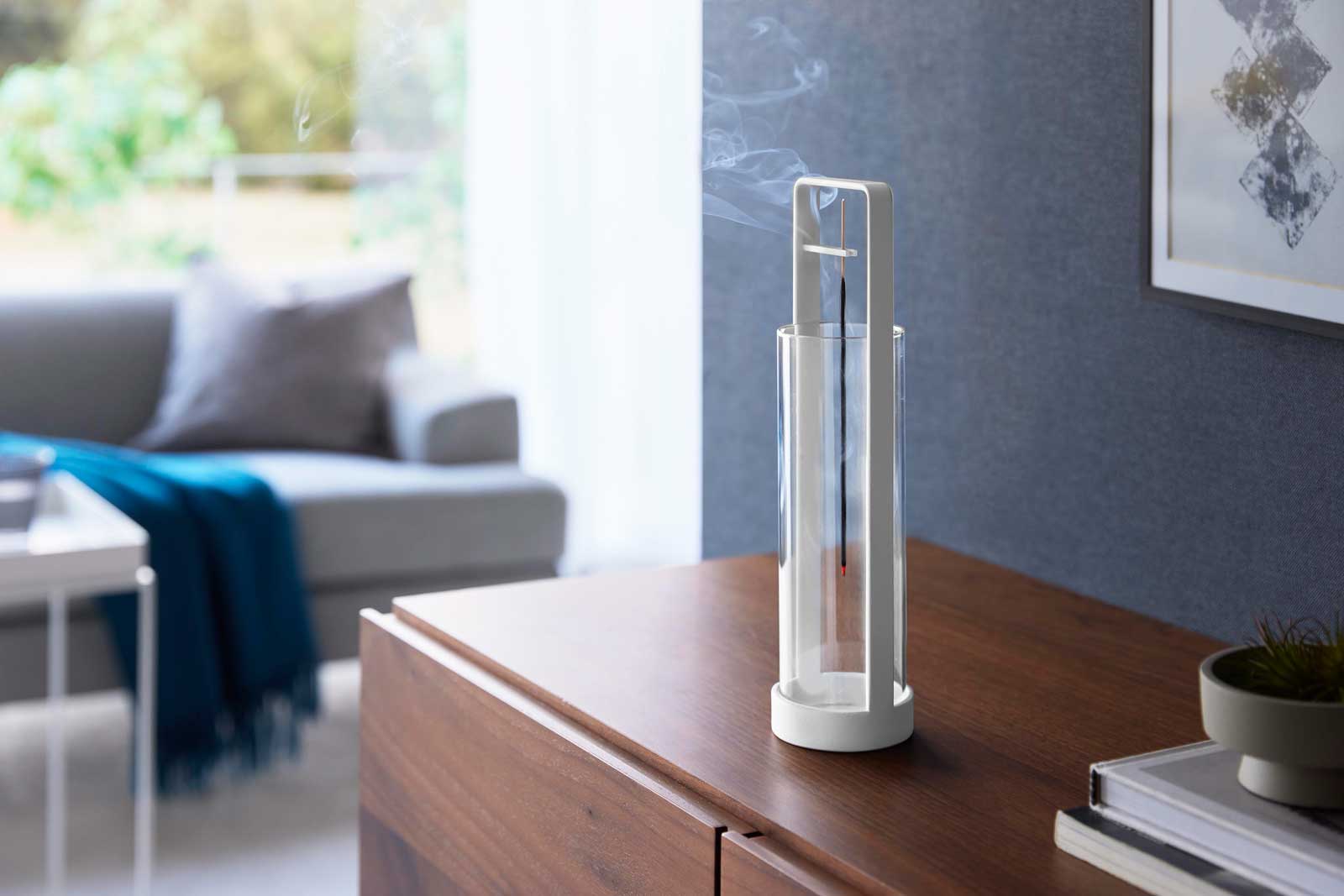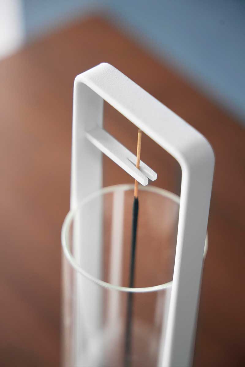 灰飛びを気にせずお香が楽しめるカバー付きお香スタンドです。スティックタイプのお香をホルダー部に差し込むだけでしっかり固定でき、お香を浮かせて香りを楽しめる吊り下げ式です。カバーは取り外せるので、ガラスカバーを外しての使用も可能。お手入れも簡単です。