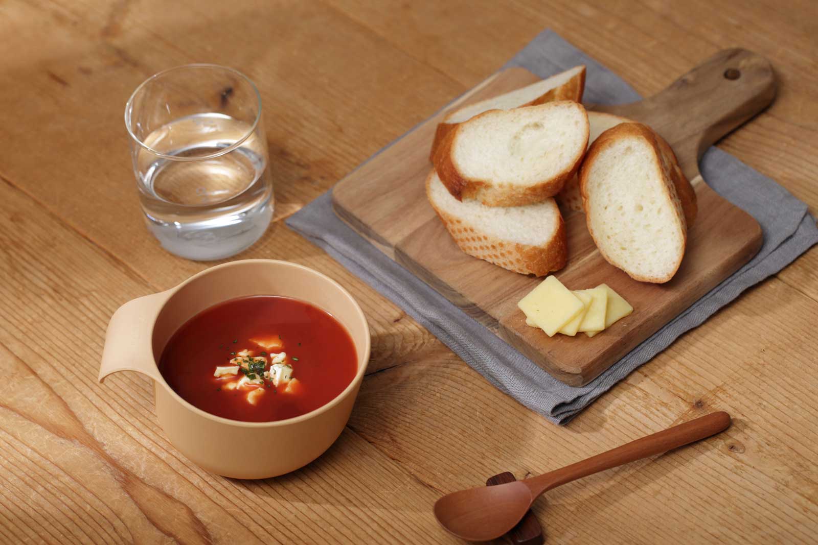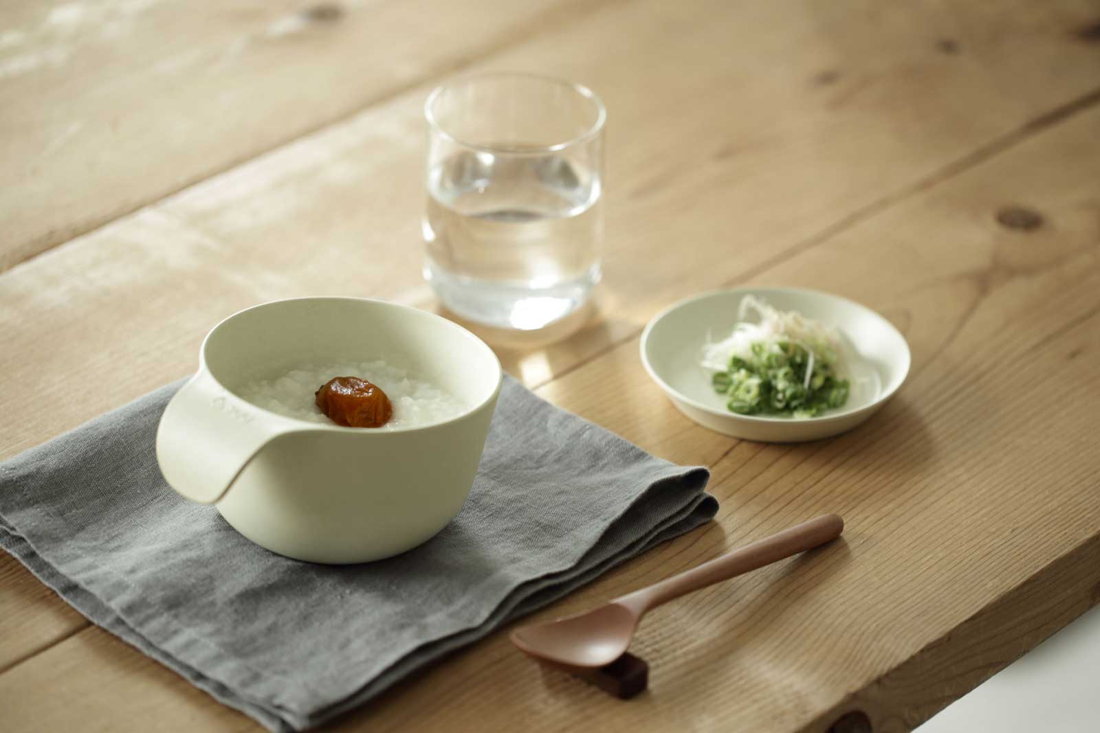 SOU×ideaco 最後まですくえる器、Rサイズは容量320mlのお茶碗サイズ。お子様の初めての食器からお年寄りまで誰でも使いやすい器を、合同会社SOU代表 中岡亜希氏とコラボしユニバーサルな視点でテーブルウェアのデザインを考案。この製品は、50%が竹でできているバンブーメラミンb fiber素材を使用したエコな食器です。