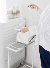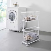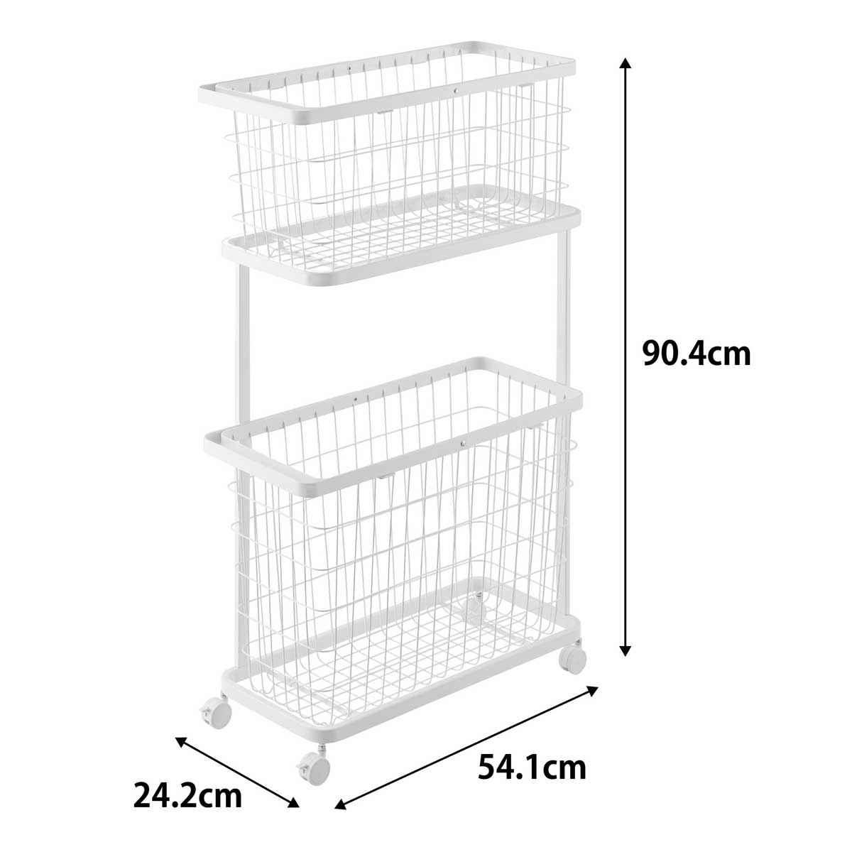 タワー ランドリーワイヤーバスケット スリム MとLサイズのワイヤーバスケットを収納できるランドリーワゴンセットです。隙間や壁沿いにも置きやすいスリム設計で、洗濯機横などのちょっとした隙間にもすっきりと収まります。