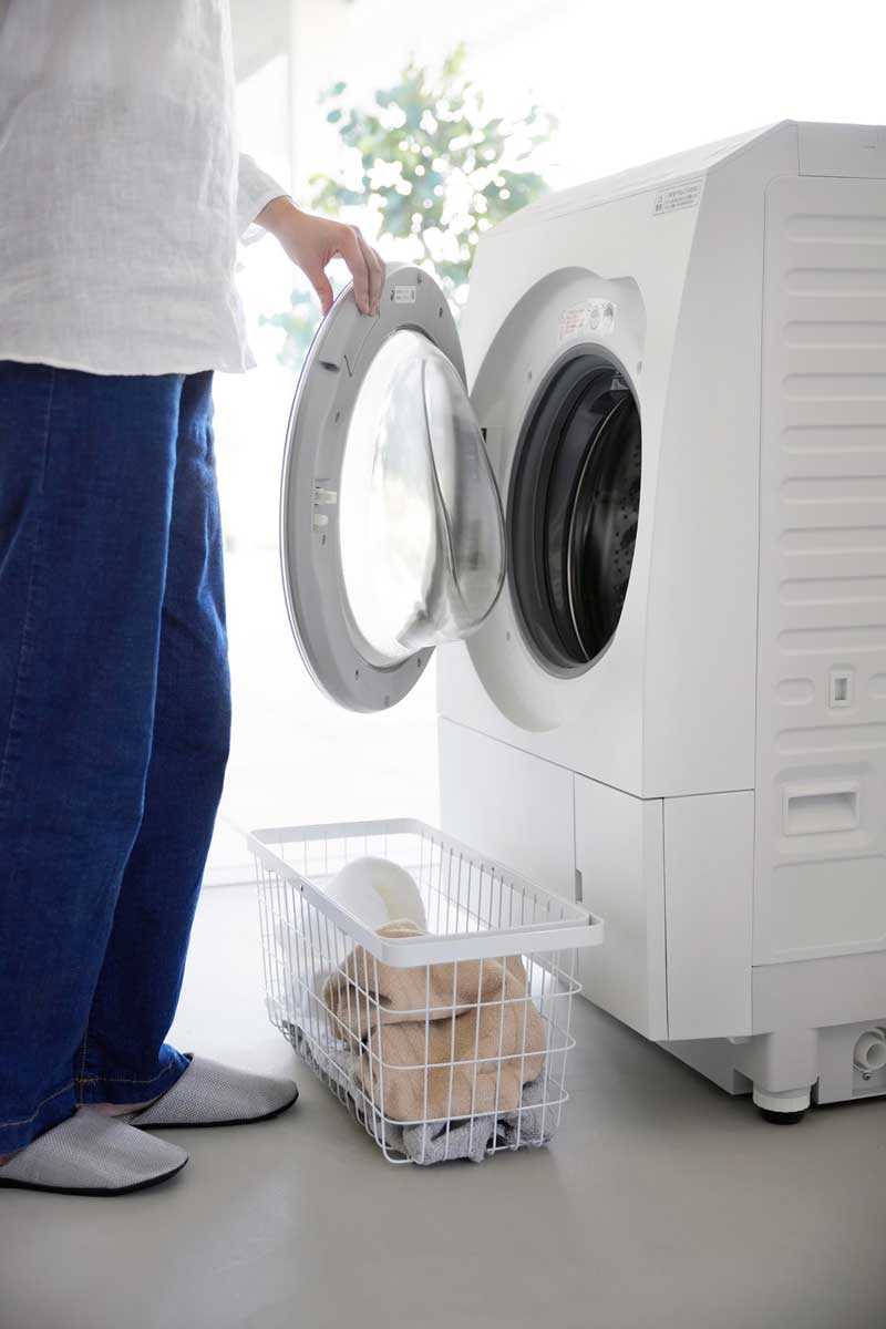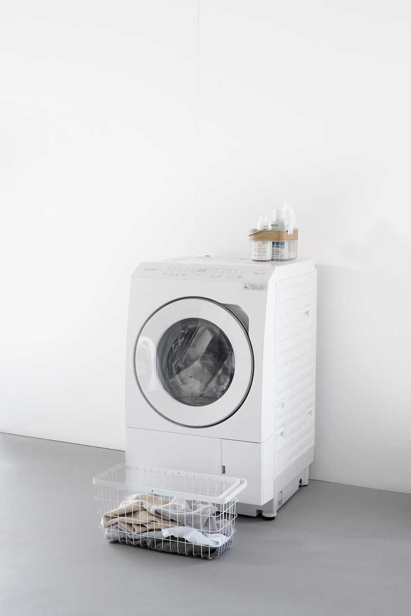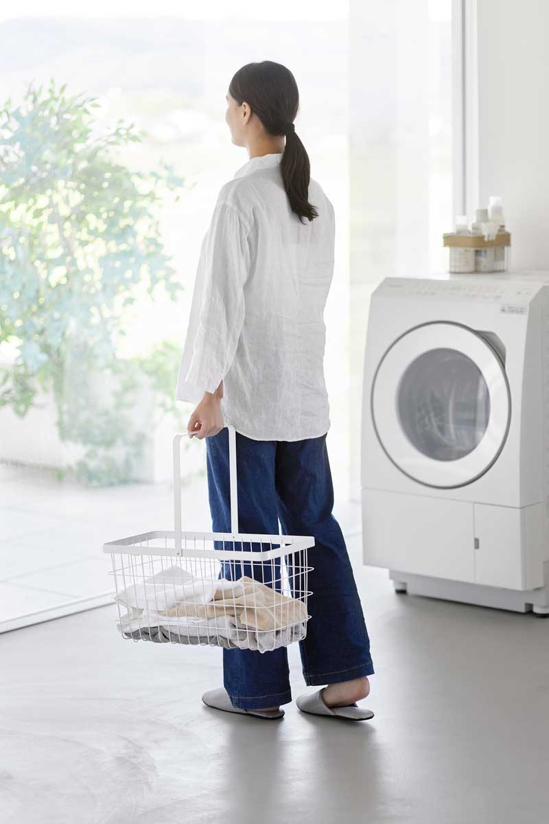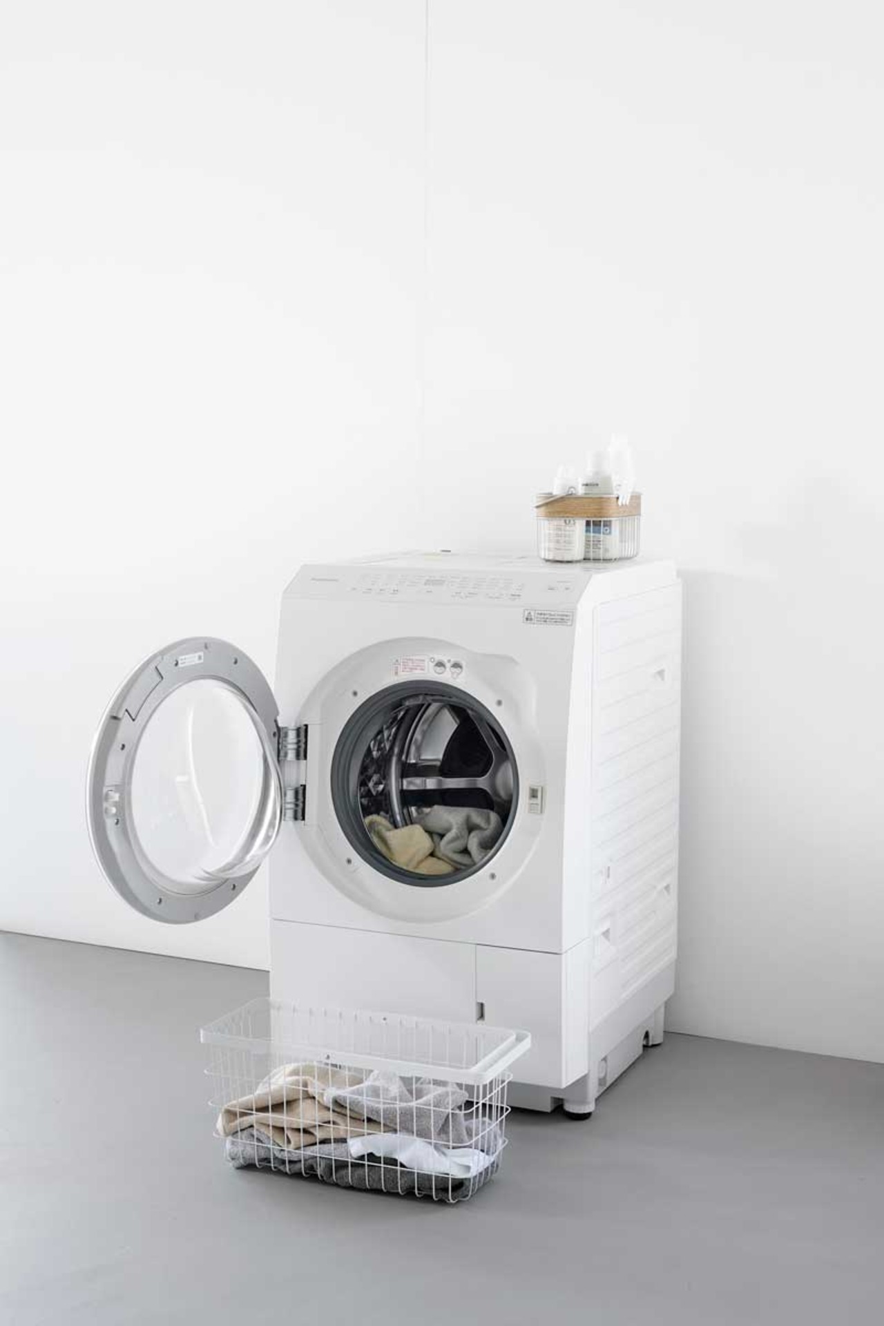 シンプルでスタイリッシュなデザインのスリムタイプのランドリーバスケットです。バスケットの高さはドラム式洗濯機の扉に干渉しない設計のため、洗濯物の出し入れもスムーズです。