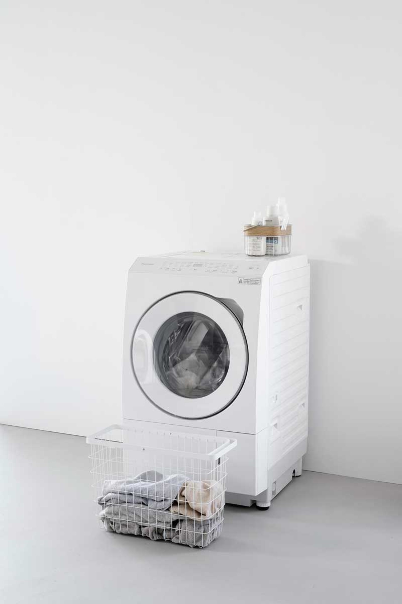 シンプルでスタイリッシュなデザインのスリムタイプのランドリーバスケットです。バスケットの高さはドラム式洗濯機の扉に干渉しない設計のため、洗濯物の出し入れもスムーズです。