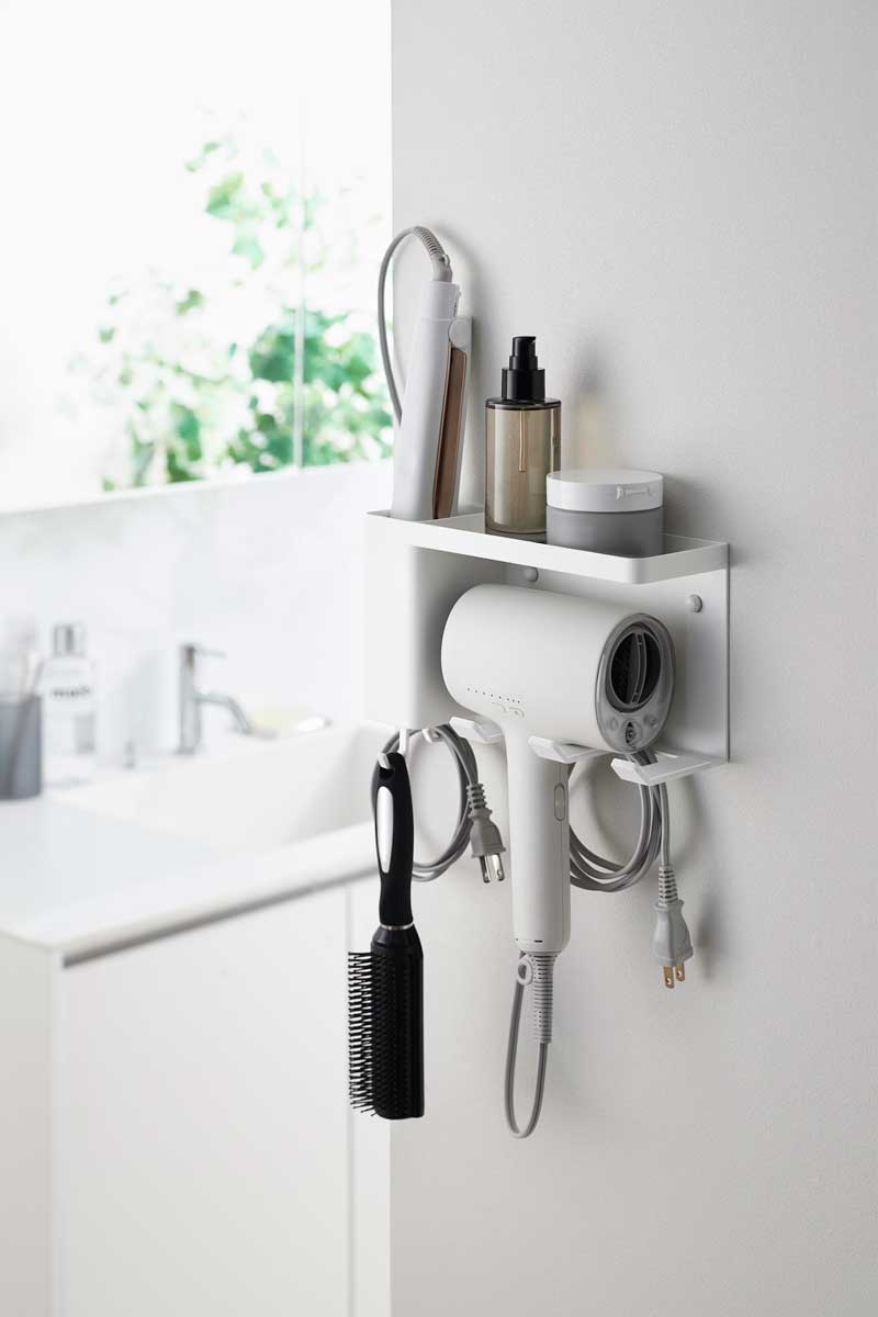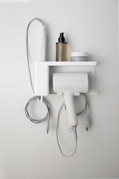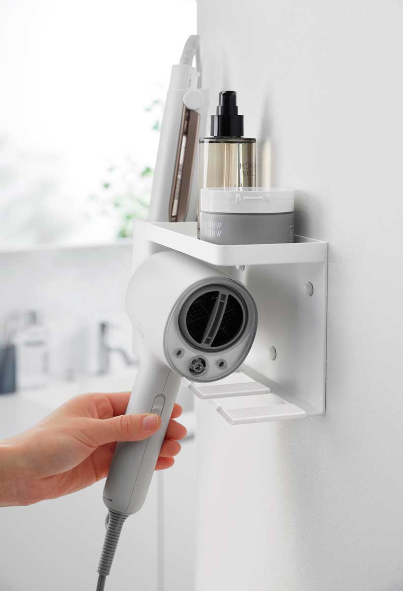 石こうボードピンで壁に取り付けできるトレー付きのドライヤーホルダーです。ドライヤーは引っ掛けるだけの簡単収納で、様々な形状に対応しており、ヘアーアイロンやブラシドライヤーなどもまとめて収納できます。