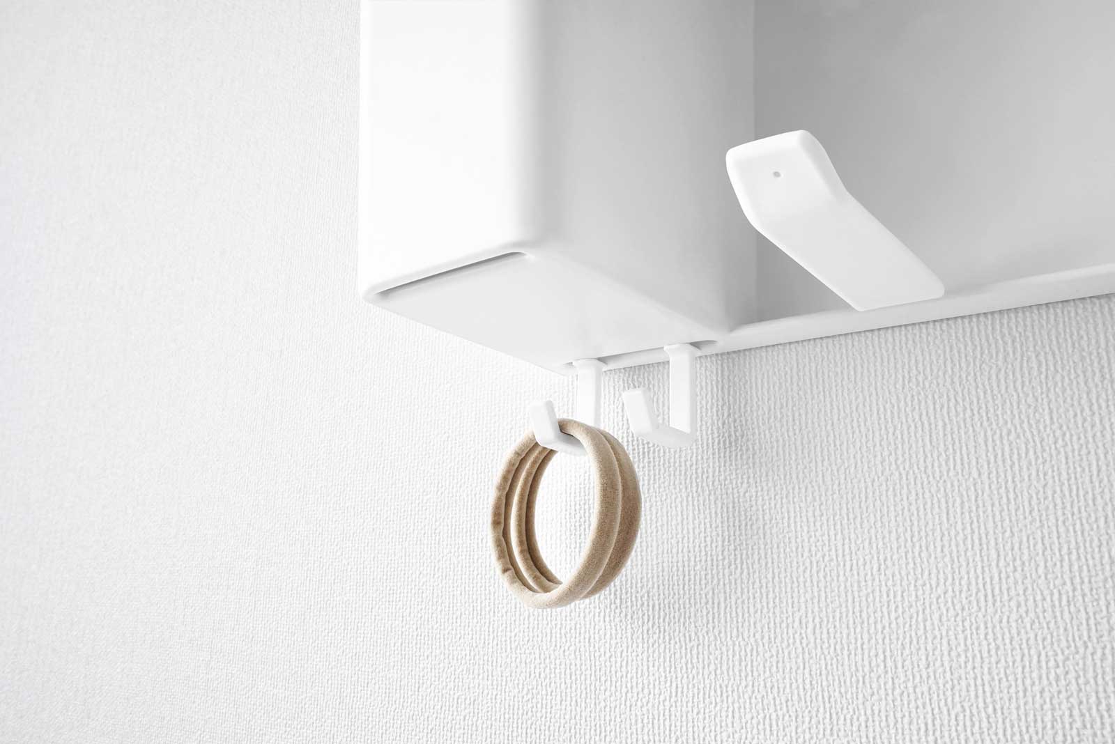 ホルダー部にはシリコーン製カバーが付いているので、ドライヤーにキズがつきにくい仕様。電源コードもホルダー部に掛ければ、すっきりと収納。上部は小物置きとして使えるトレーになっており、小物を引っ掛けておくのに便利な可動式フックも付属しています。
