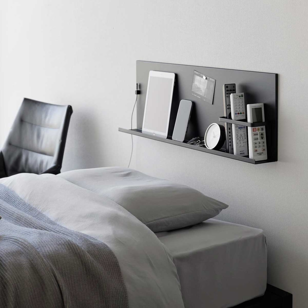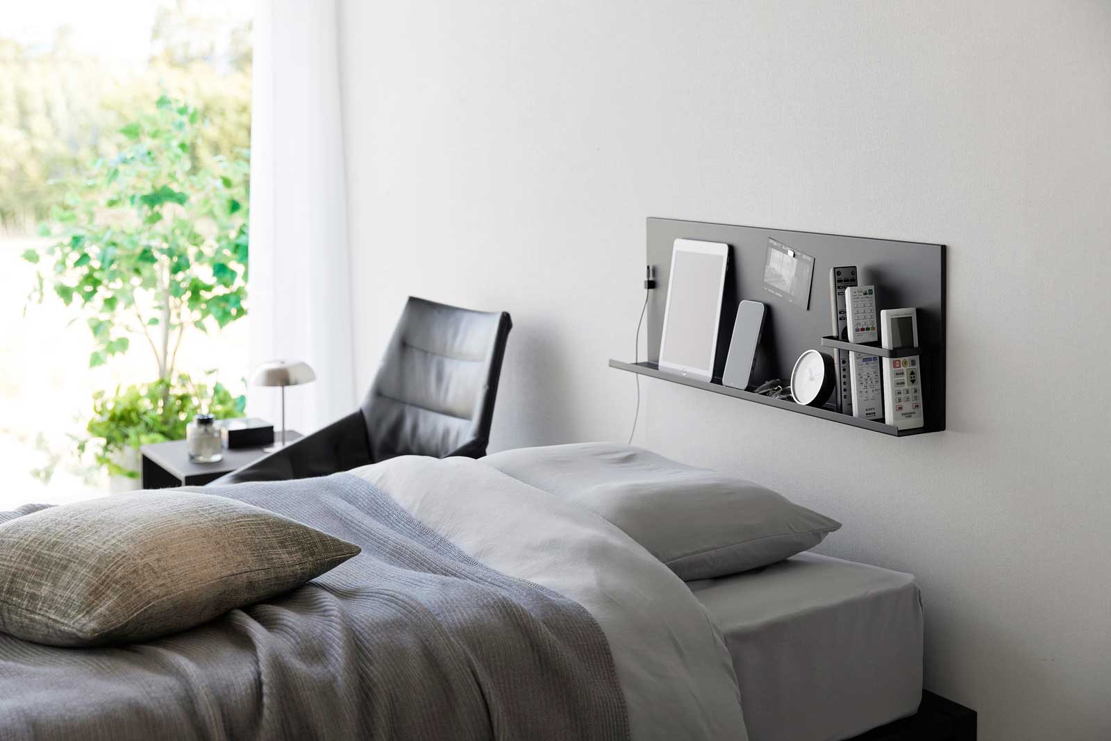 石こうボードピンで簡単に取り付けられる、強力なスチールパネルです。ヘッドボードやサイドボードとしても便利に使え、リモコンやタブレットPCなどの小物を手の届く場所にすっきり収納できます。