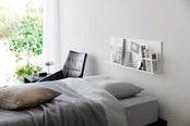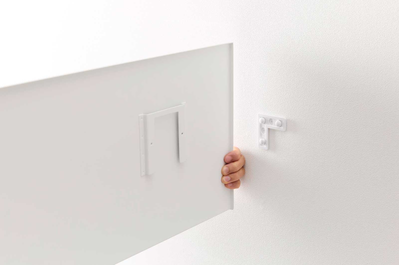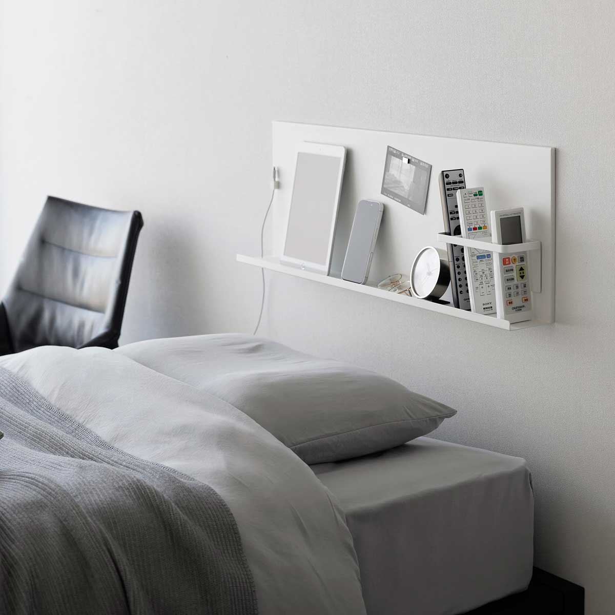 石こうボードピンで簡単に取り付けられる、強力なスチールパネルです。ヘッドボードやサイドボードとしても便利に使え、リモコンやタブレットPCなどの小物を手の届く場所にすっきり収納できます。