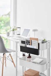 小物整理に便利な収納ホルダーです。ホルダーのフックは複数個並べたファイルボックスにも掛けられるように設計されており、正面・側面どちらにも取り付け可能です。ワゴンに引っ掛けて、ステーショナリーなど細々した物の収納にも役立ちます。