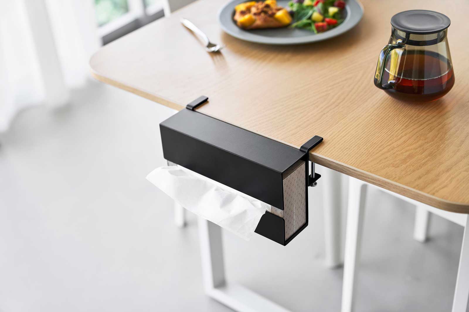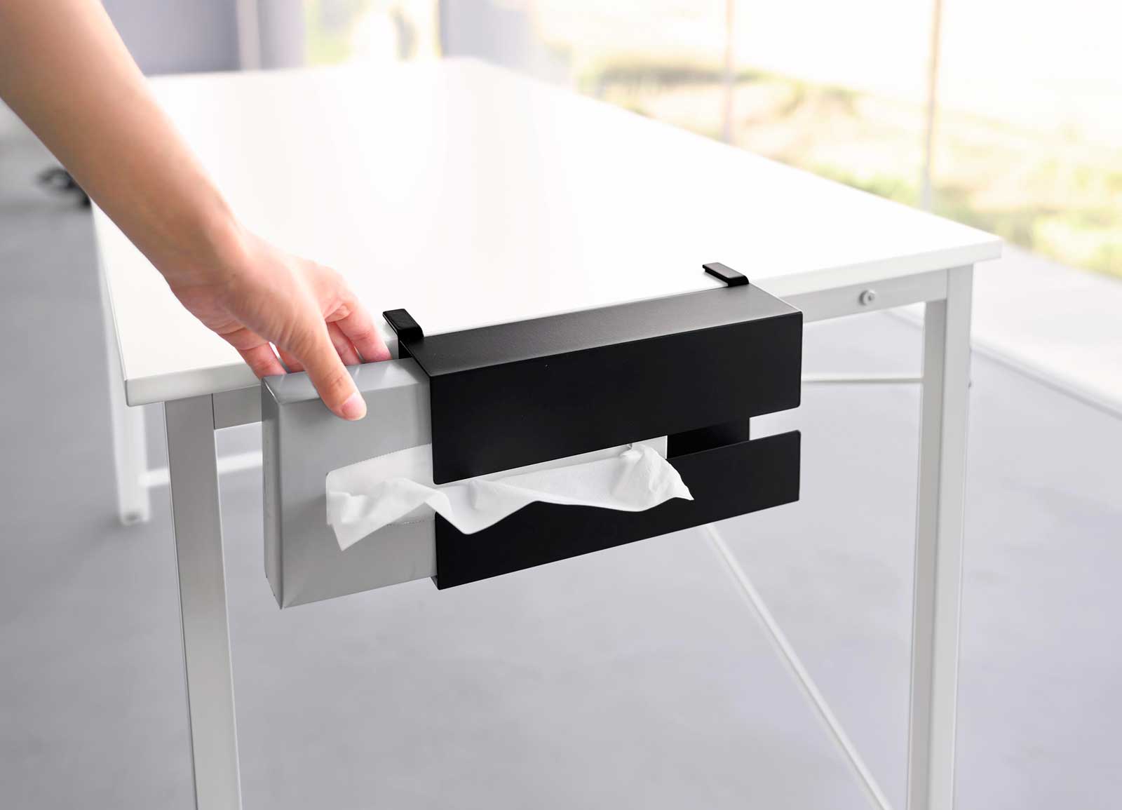 テーブル横に設置できるティッシュケース。ティッシュの交換は横から差し込むだけと簡単。ティッシュはボックスタイプだけでなくソフトタイプにも対応しています。