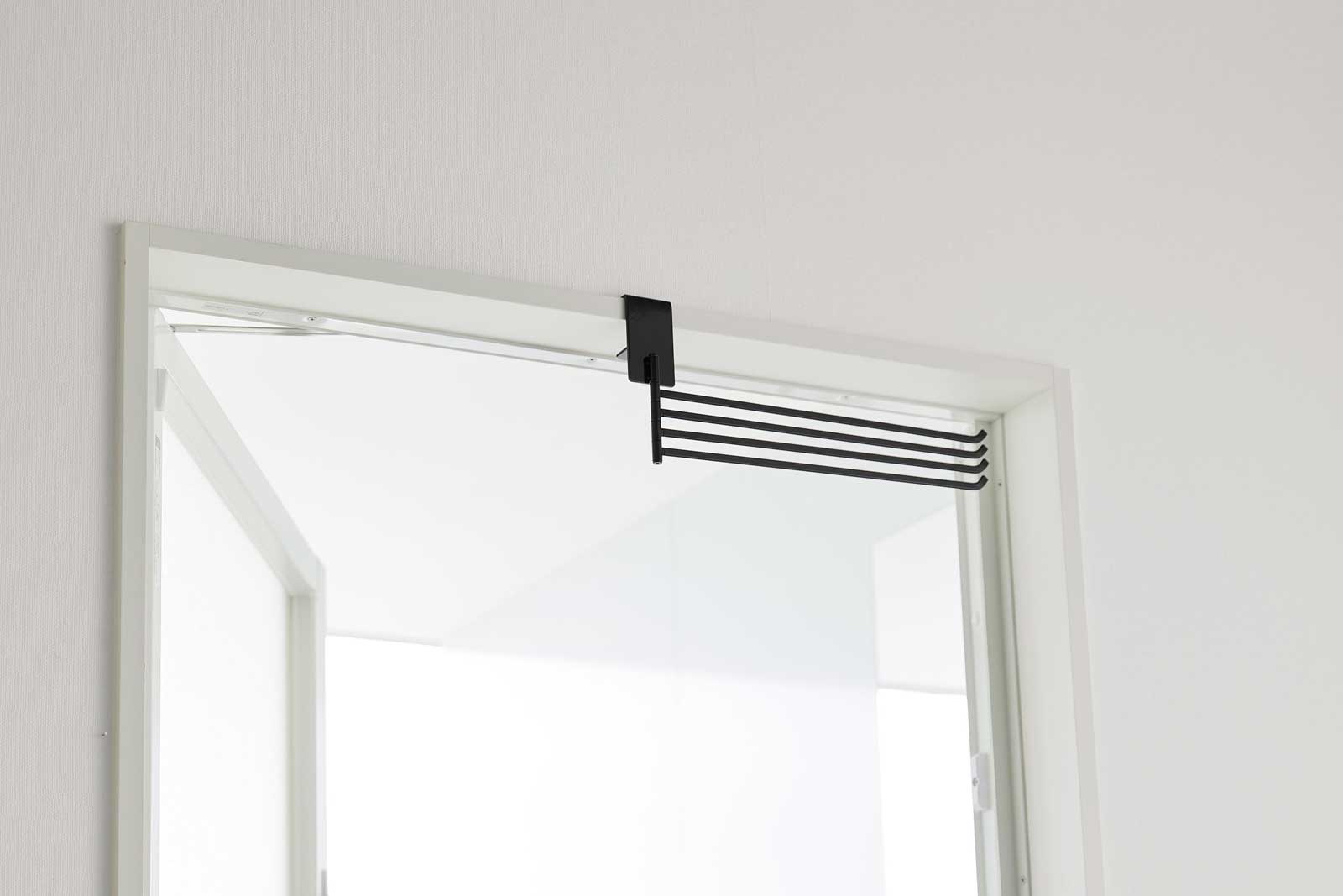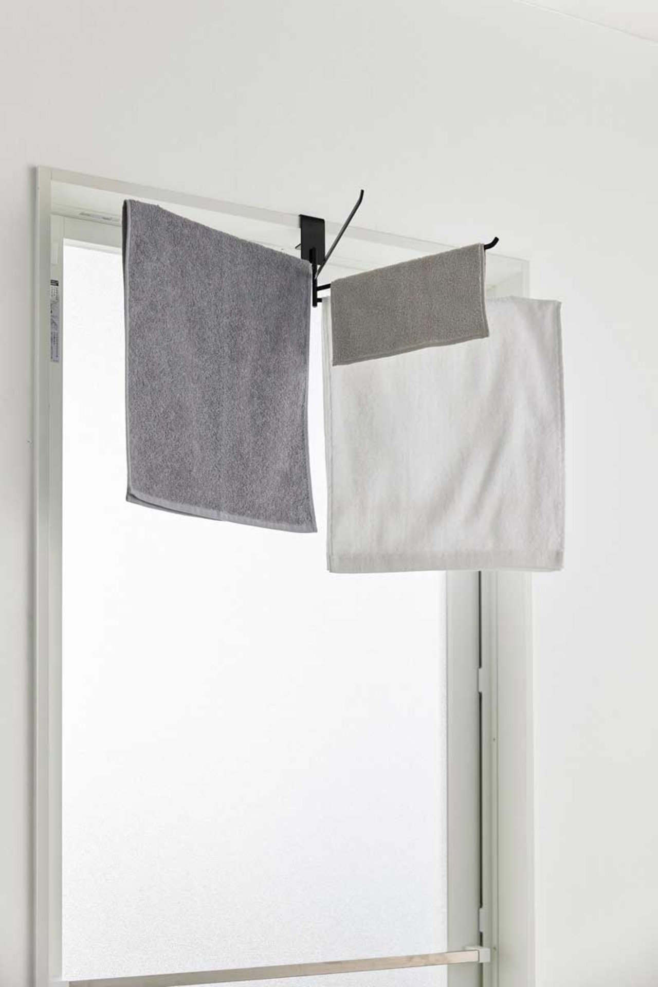 浴室のドア枠や鴨居、リビングなどの開口枠に取り付け可能な、室内用の物干しタオルハンガーです。ハンガー部分は360度回転し、広げて使えるので通気性が良く、タオルが乾きやすくて便利です。