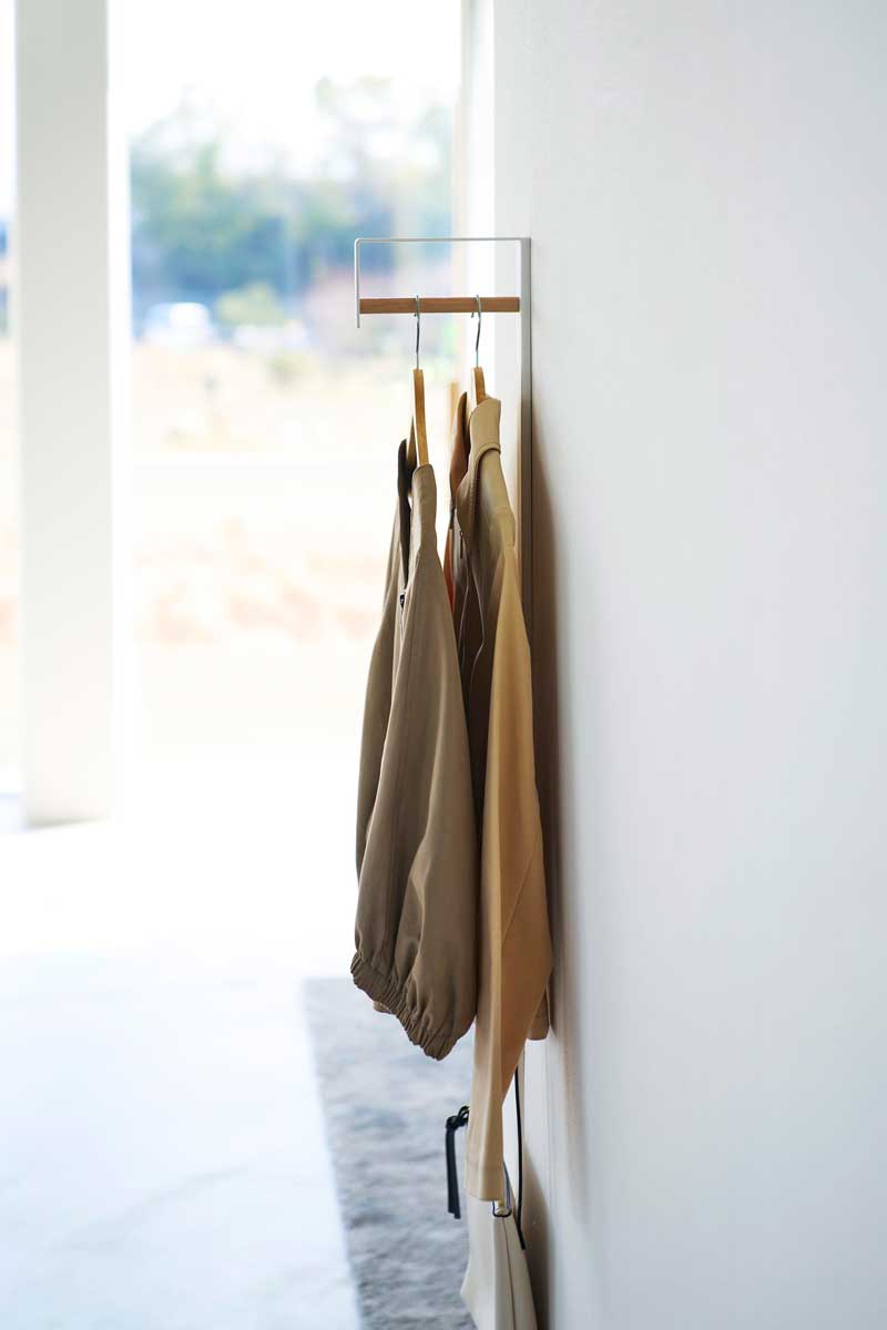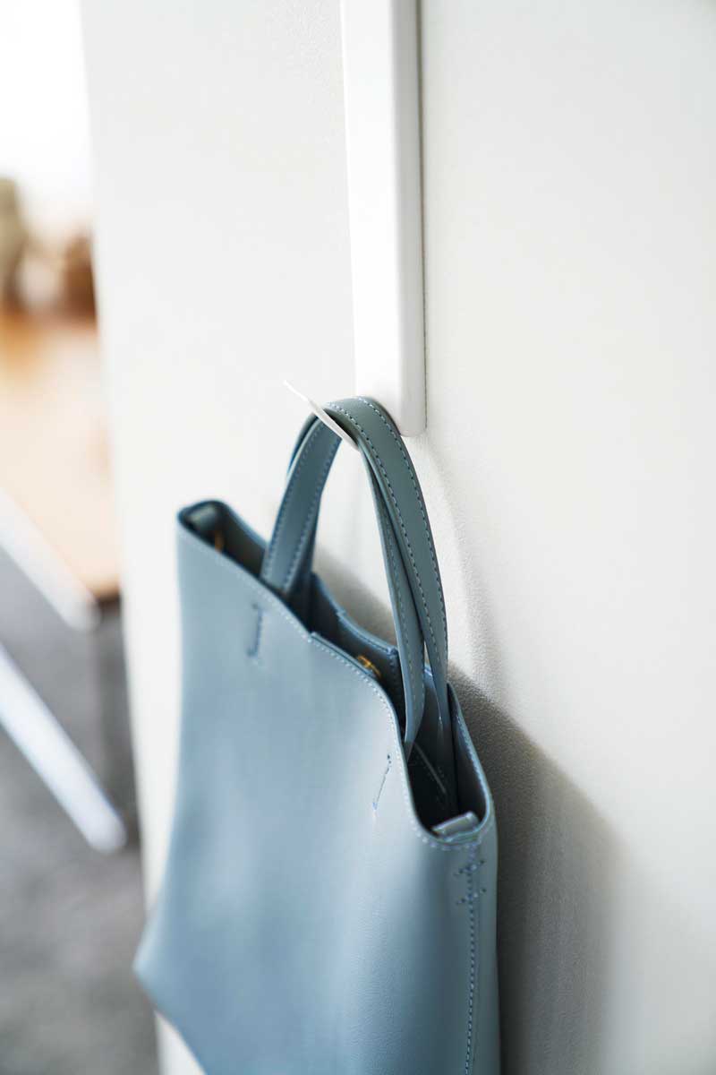お好みの高さや場所に取り付けできるので、お出かけ前にサッと手に取れて便利です。フック付きでバッグや帽子、ストールなども収納できます。壁の穴が目立ちにくい石こうボードピンの他に、木ネジでも取り付け可能です。