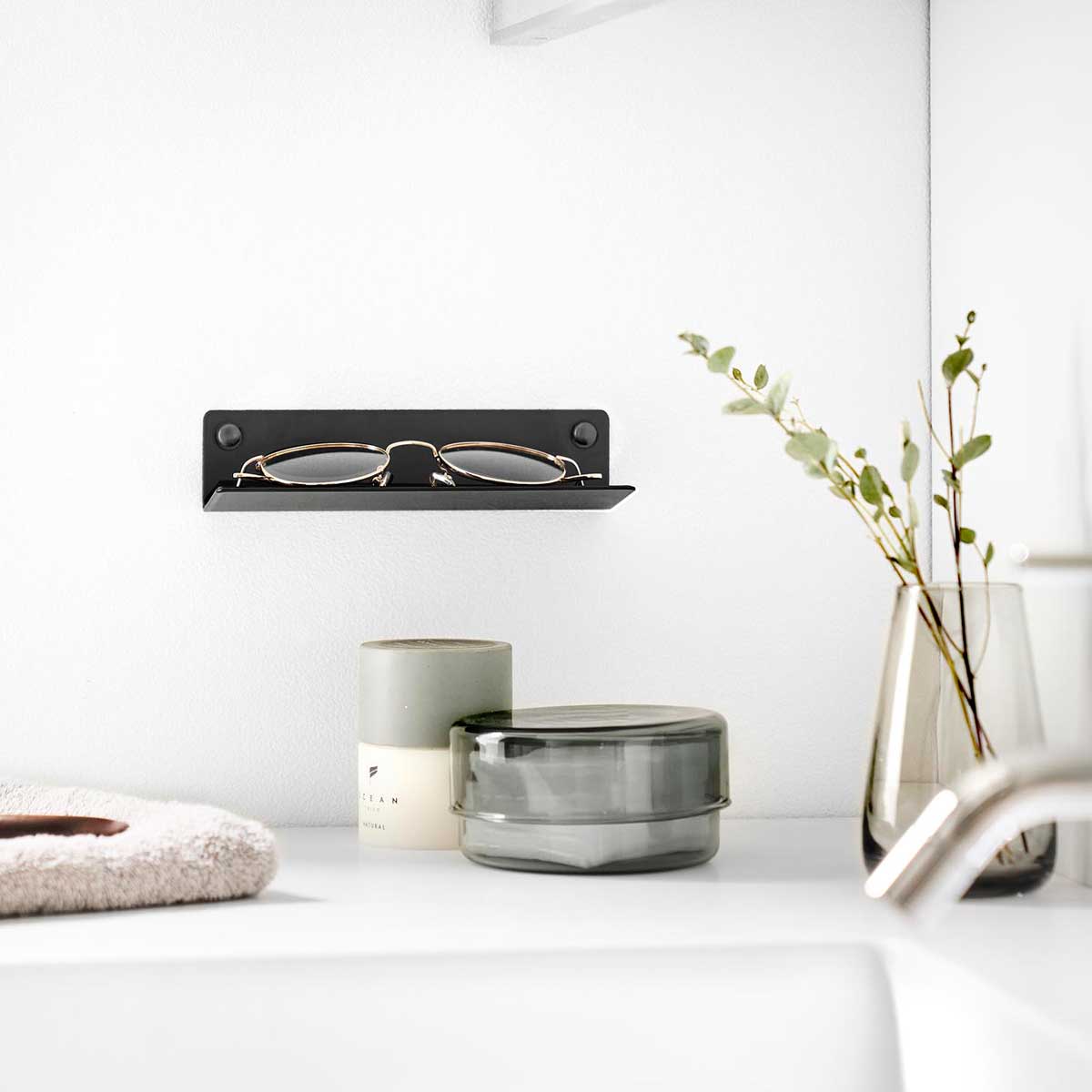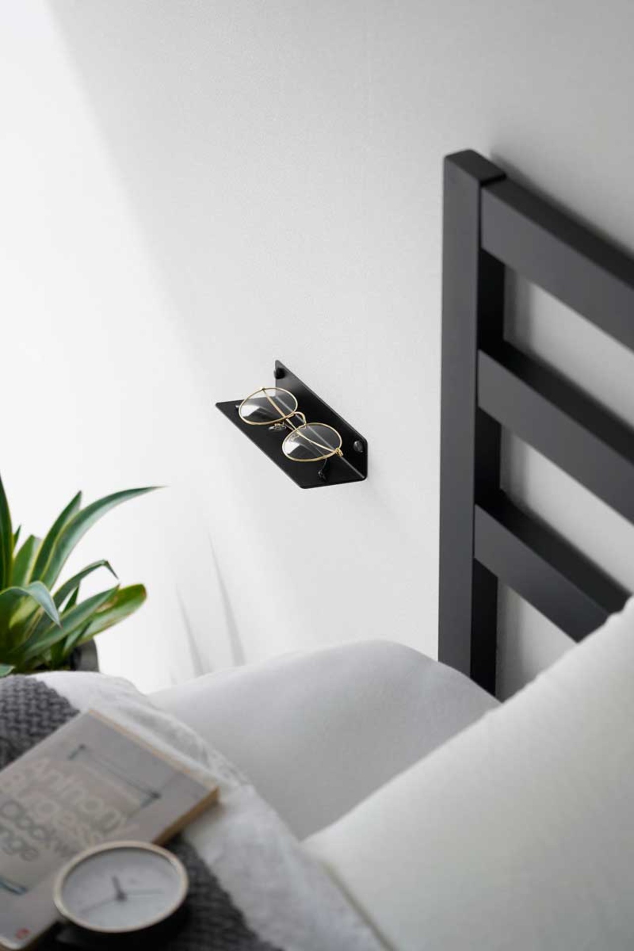 入浴や洗顔時の一時置きに便利なメガネラック。石こうボードピンで壁に浮かせて設置できるメガネラックです。滑り止めシートが付いているので収納物のキズや滑り落ちを防ぎます。
