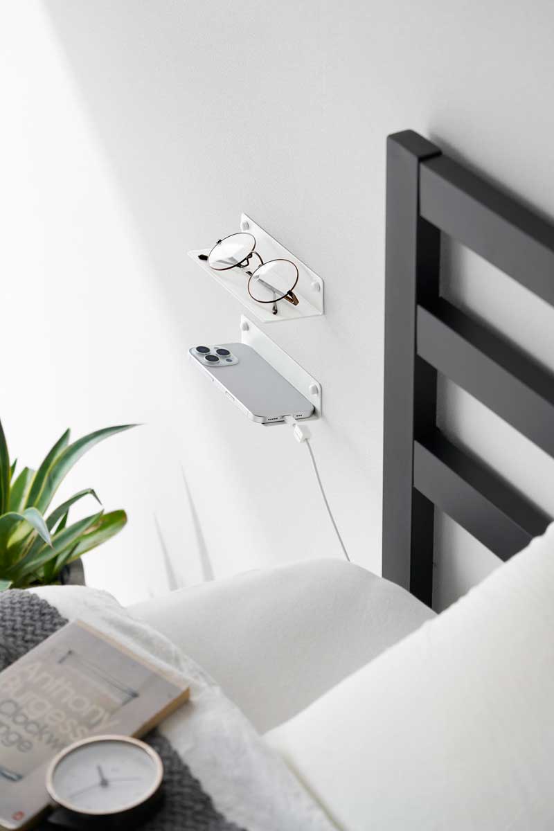 メガネラック以外にも、スマホ置きとしての使用もおすすめです。充電ケーブルを取り付けられる、マグネットケーブルホルダー付き。スチール製の本体にケーブルの先端を貼り付けておけるので、すぐに充電できて便利です。