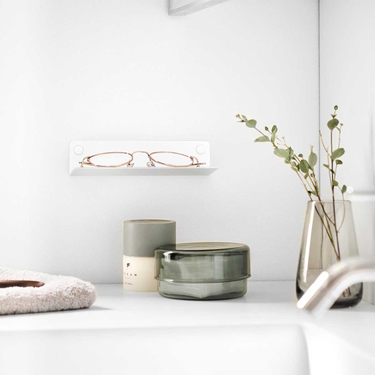 入浴や洗顔時の一時置きに便利なメガネラック。石こうボードピンで壁に浮かせて設置できるメガネラックです。滑り止めシートが付いているので収納物のキズや滑り落ちを防ぎます。