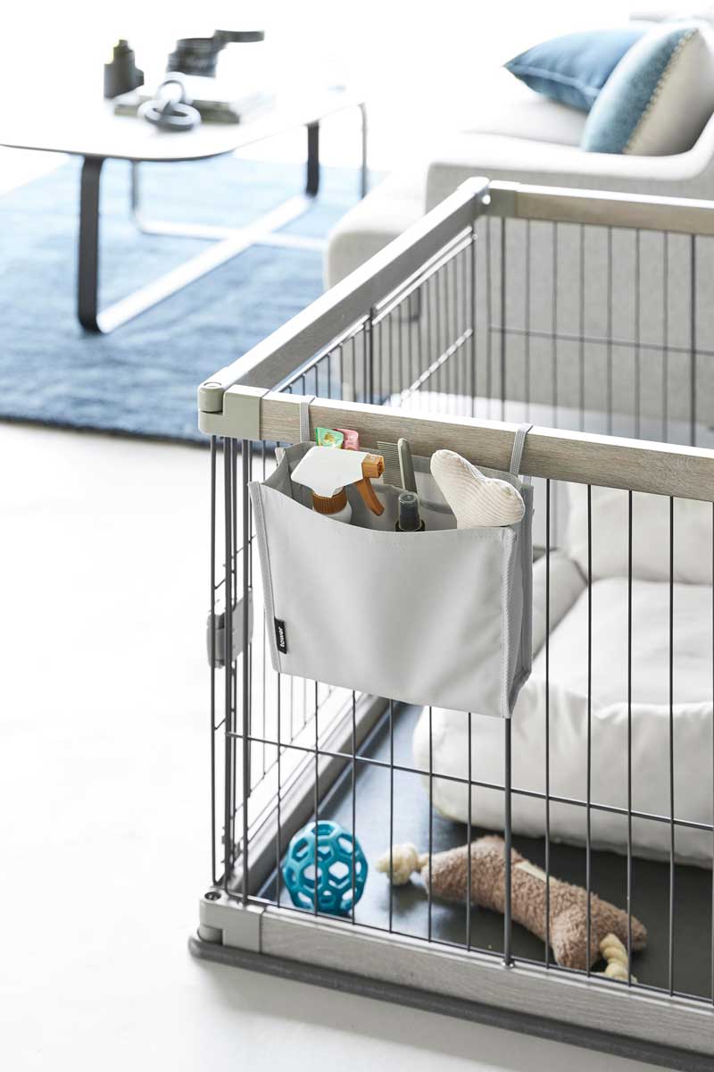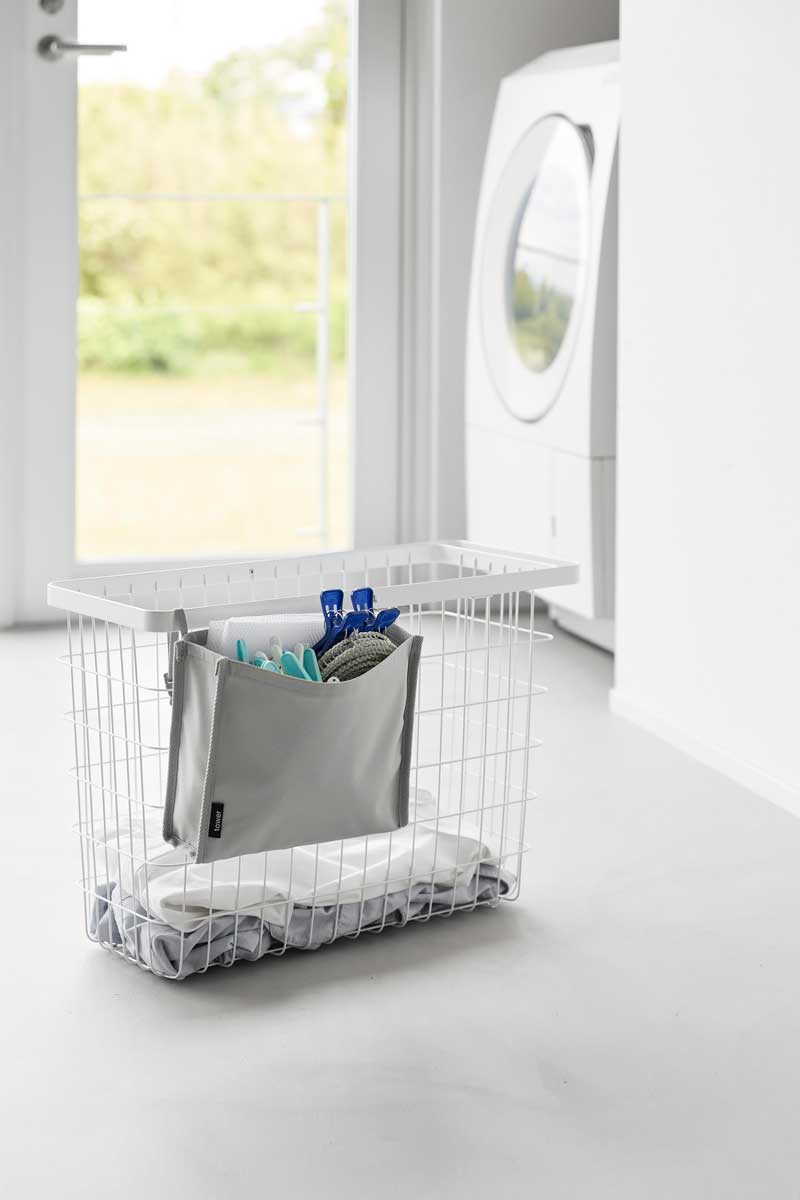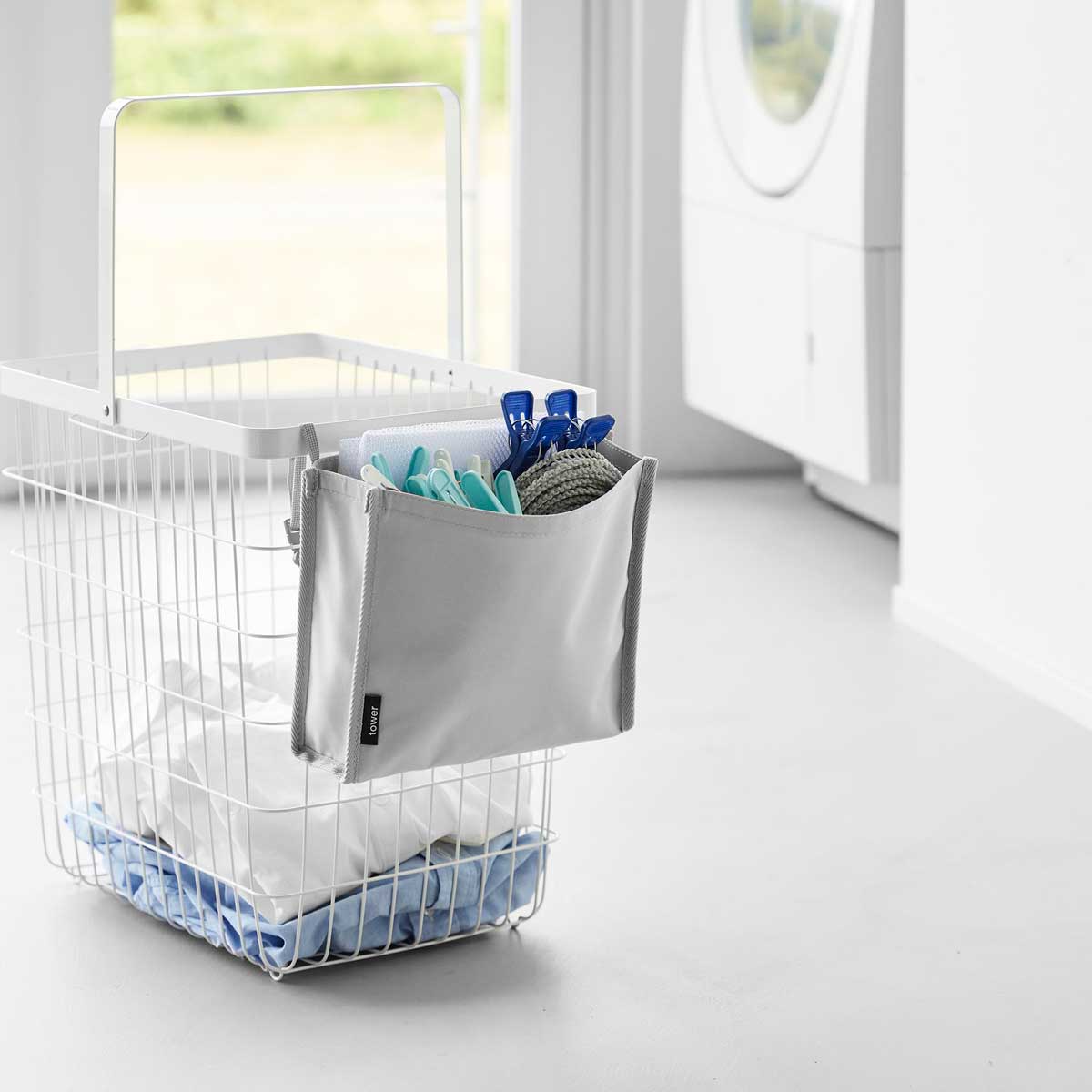 洗濯カゴにポケットを取り付けて、ピンチやネットなどの洗濯小物をまとめて収納できます。背面には着脱しやすいバックル付きで、ベルトの長さも調節可能なので、様々なランドリーバスケットに対応します。