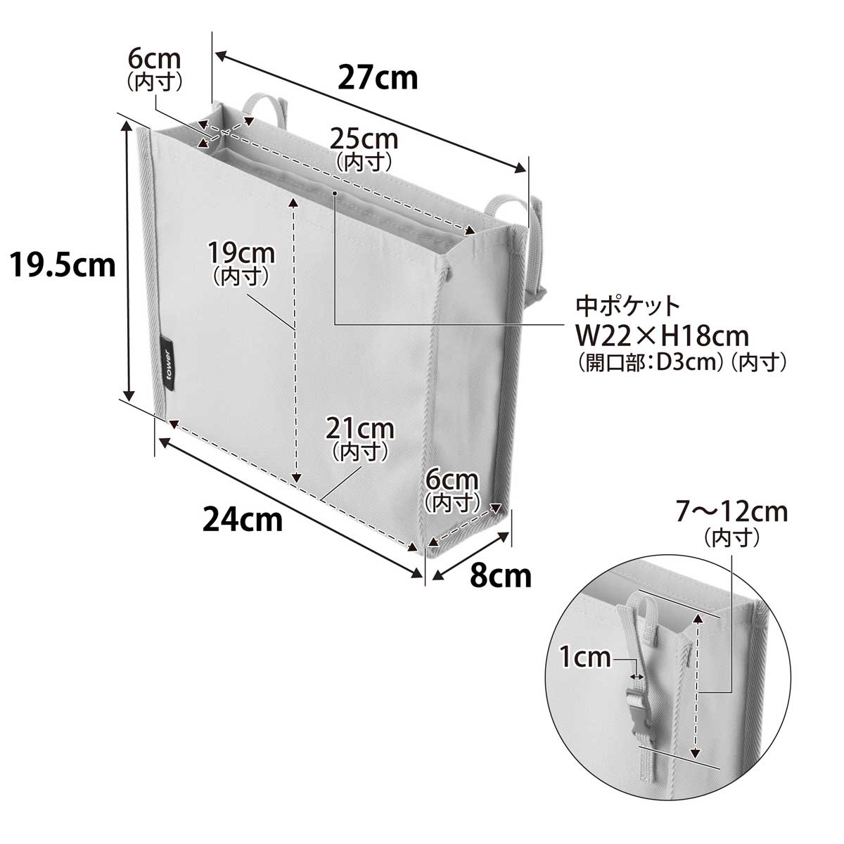 ・内寸サイズ:約W250xD60xH190mm(収納部)/約W220xH180mm(中ポケット 開口部D30mm)/約70-120mm(ループ部の長さ)
