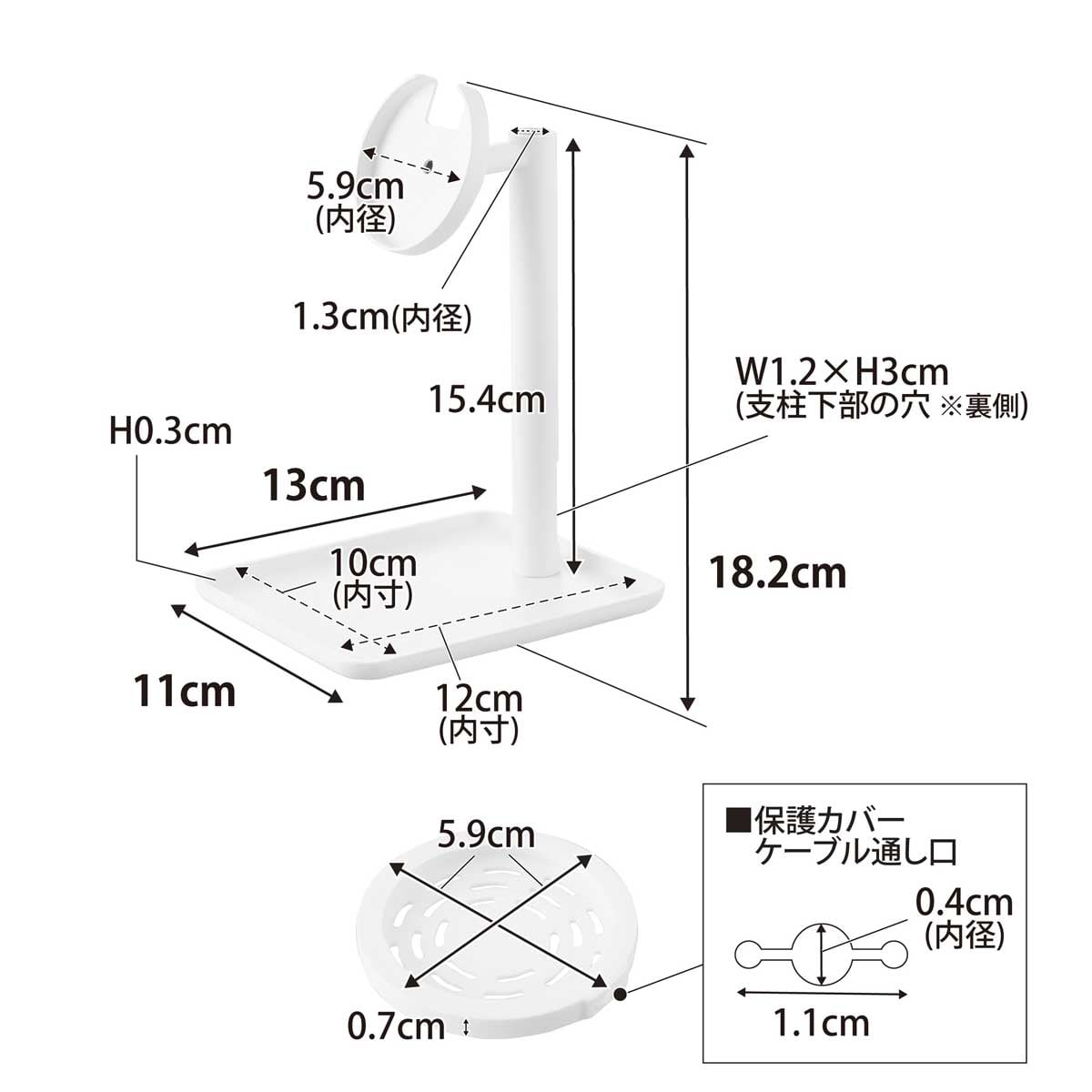 ・内寸サイズ:内径約59mm(ホルダー部)/約W11mm、内径約4mm(保護カバーケーブル通し口)/内径約13mm(支柱上部の穴)/約W12xH30mm(支柱下部の穴)/約W100xD120xH3mm(トレー部)