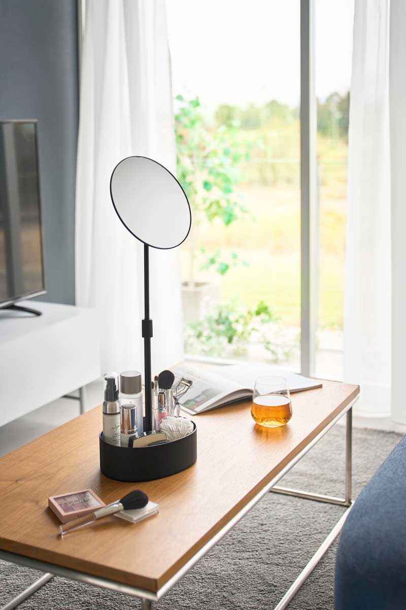 ミラーの高さは、支柱を最大55cmまで伸ばして調節できるため、ローテーブルでも使いやすい設計です。支柱の固定位置は中央と端の2か所から選べ、端に配置すれば収納部を広々と活用できます。