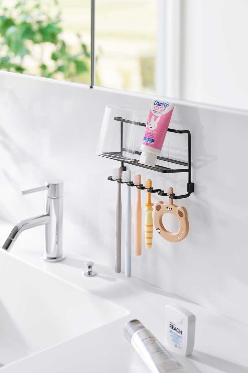 貼り付けたフィルムフックに掛けるだけ!簡単に取り付けできる歯ブラシ&チューブホルダーです。浮かせて収納できるので乾きやすく衛生的で、コップなどのお子様用グッズもしっかり水切れし、清潔に収納できます。設置場所を工夫すれば長いチューブも収納可能で、置き場所に困るマウスピースの乾燥スペースとしても便利です。