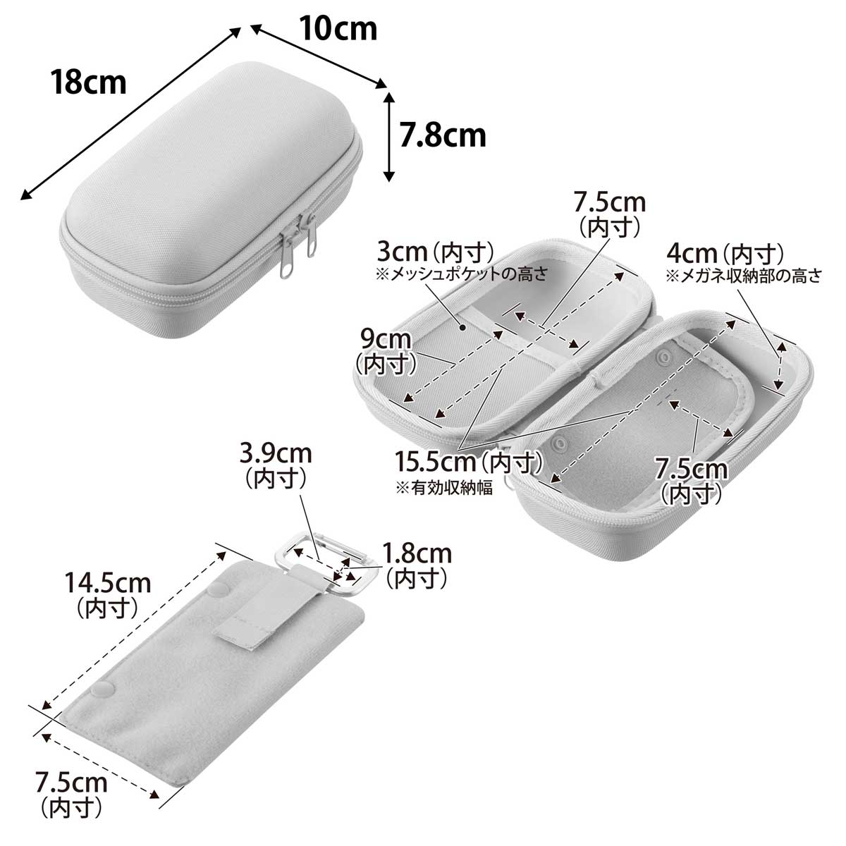 ・内寸サイズ:約W155xD75XH40mm(メガネ収納部)/約W90xD75XH30mm(メッシュポケット)※有効収納幅約W155mm