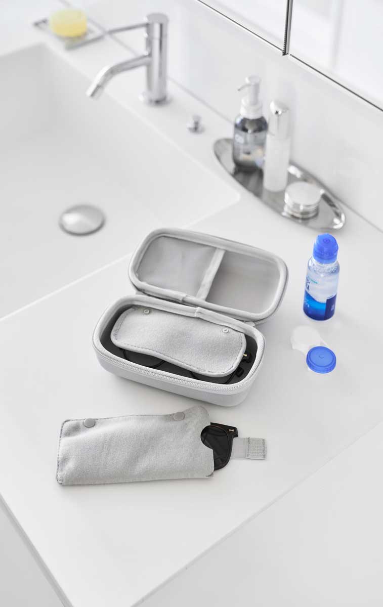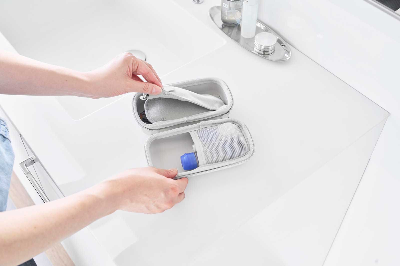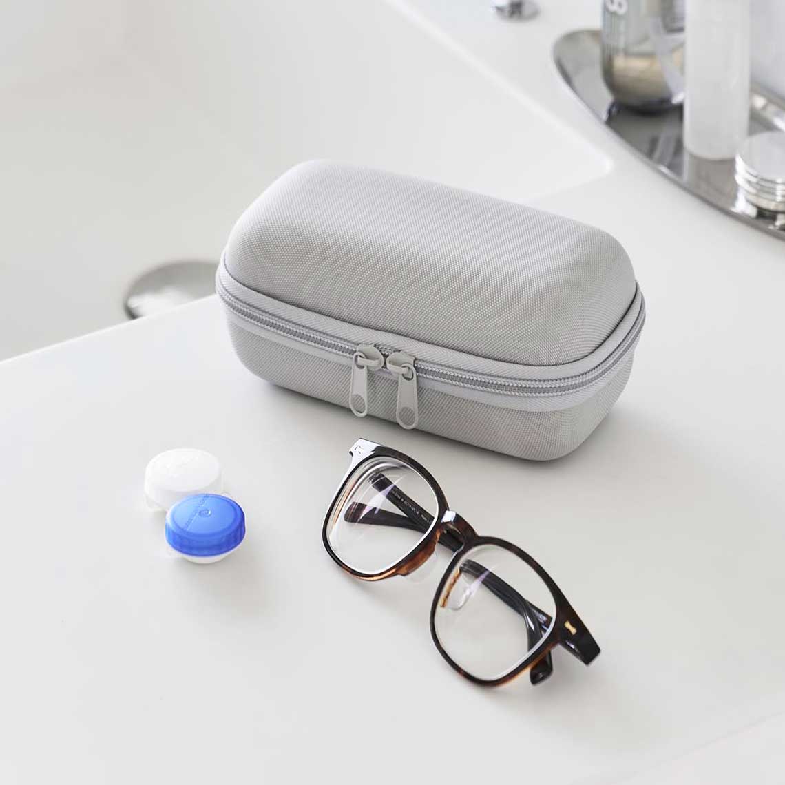 メガネとコンタクトレンズ用品をまとめて収納できるメガネケース。ちょっとした衝撃にも安心なセミハードケースで、持ち運びに便利なので旅行や外出にもおすすめです。