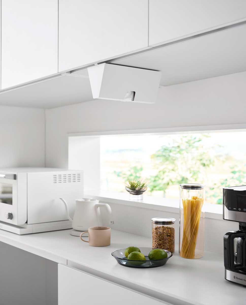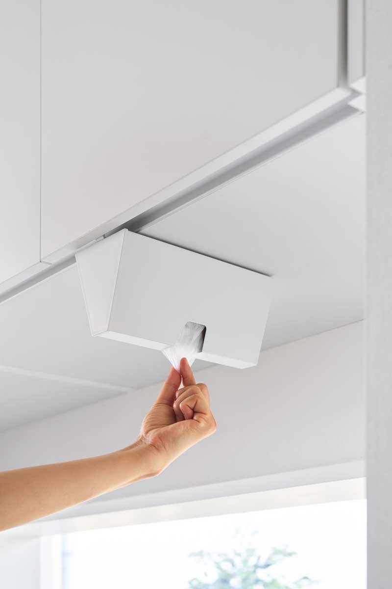 吊り下げ戸棚に差し込むだけで簡単に設置できる、プラスチックバッグケースです。三角形の箱入りプラスチックバッグが箱ごと収納でき、生活感を隠してスッキリとした印象に。下からサッと取り出せるので便利です。