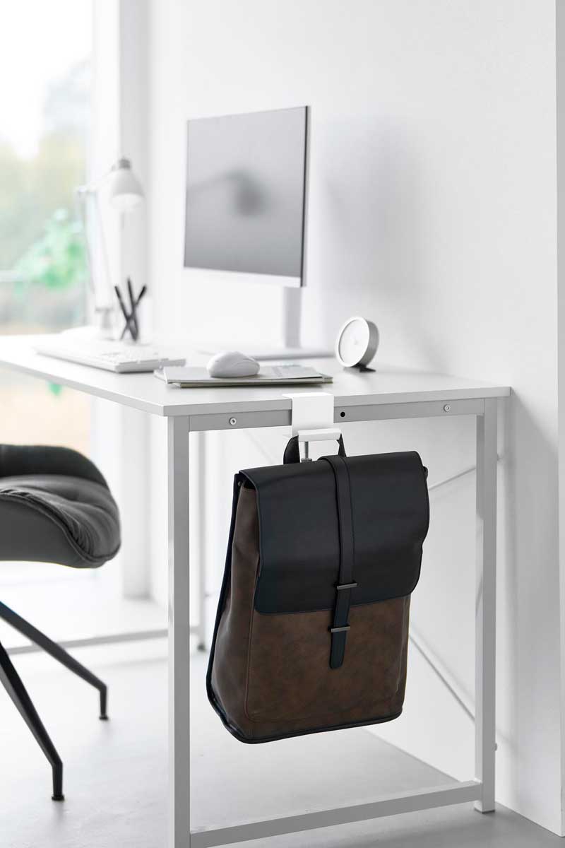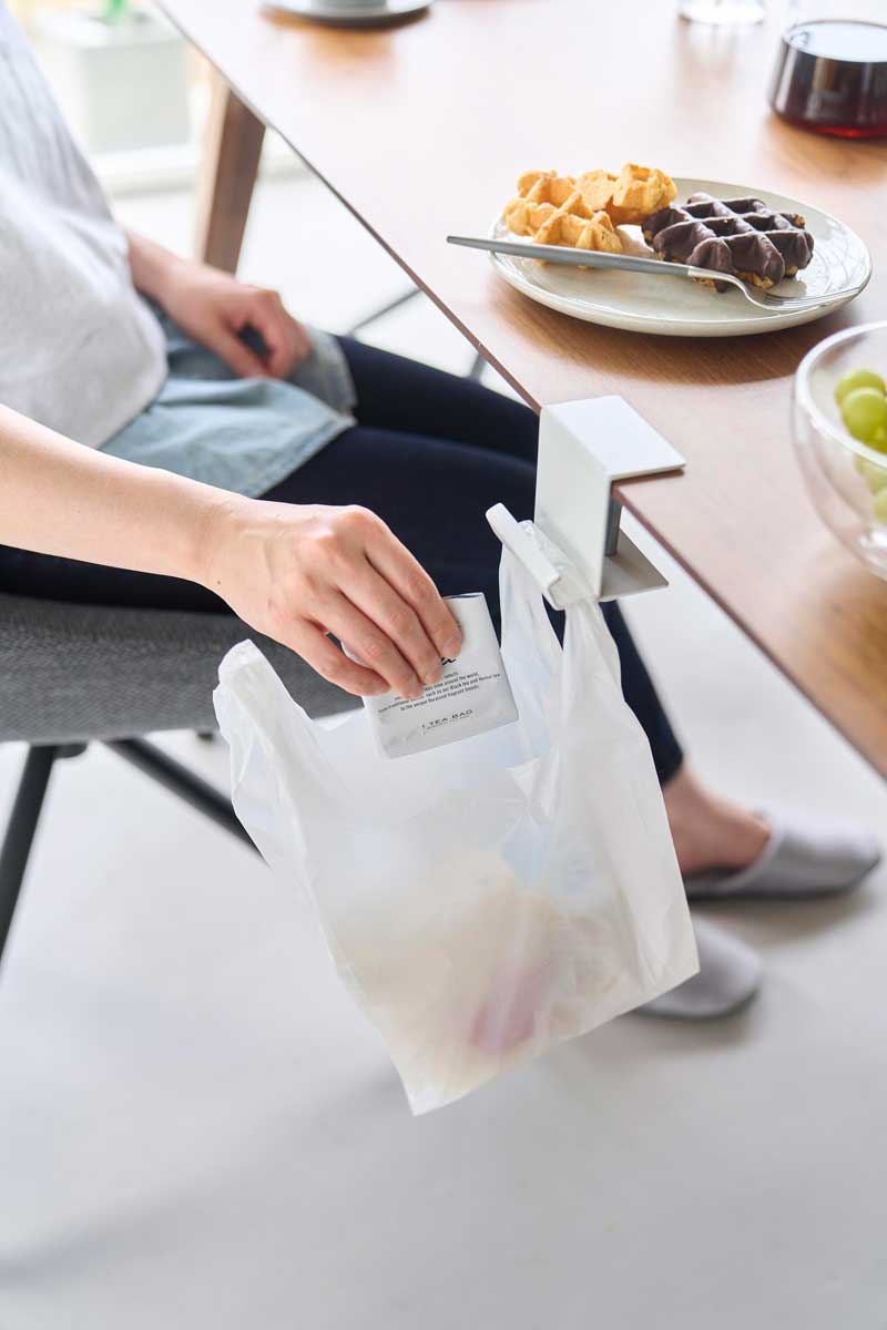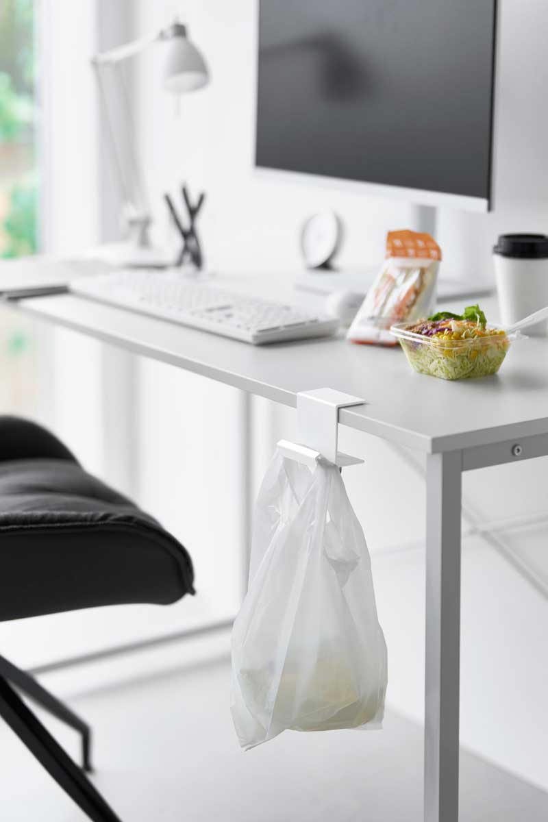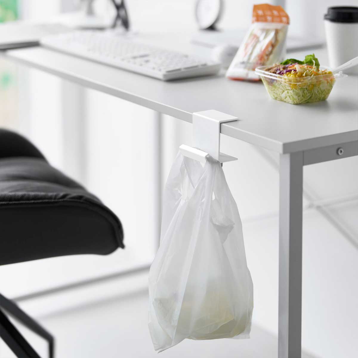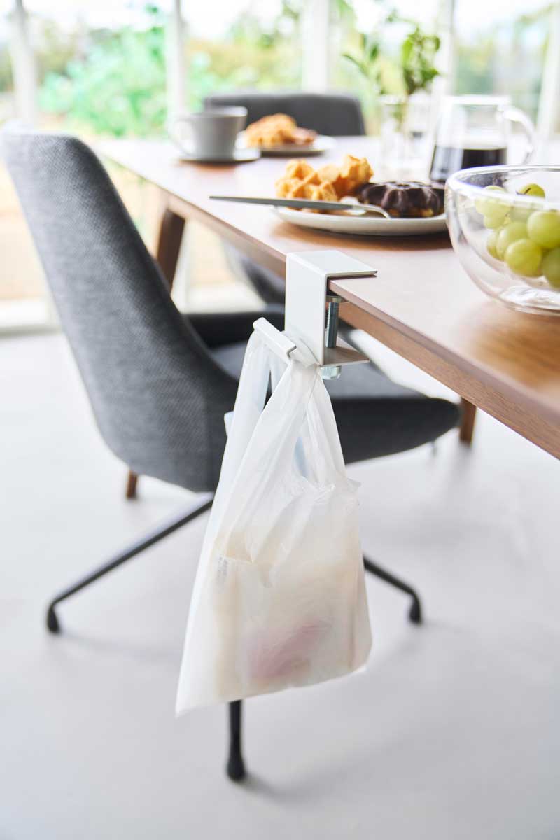 デスクやテーブルに穴をあけることなく簡単に設置できる、クランプ式のレジ袋ハンガーです。ちょっとしたゴミをその場ですぐに捨てられるので、卓上は常にすっきり。リュックやカバンを掛けるバッグハンガーとしても便利です。