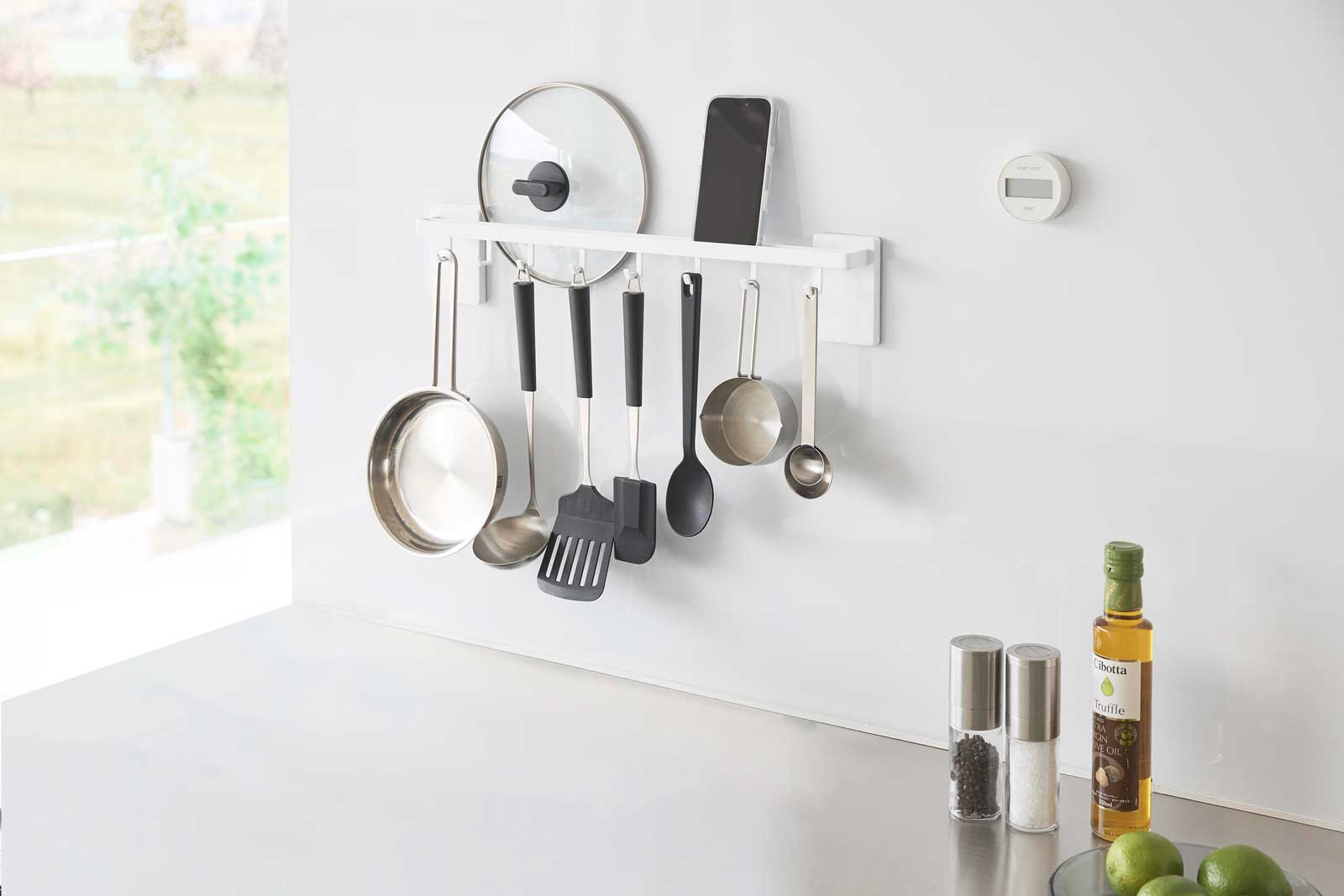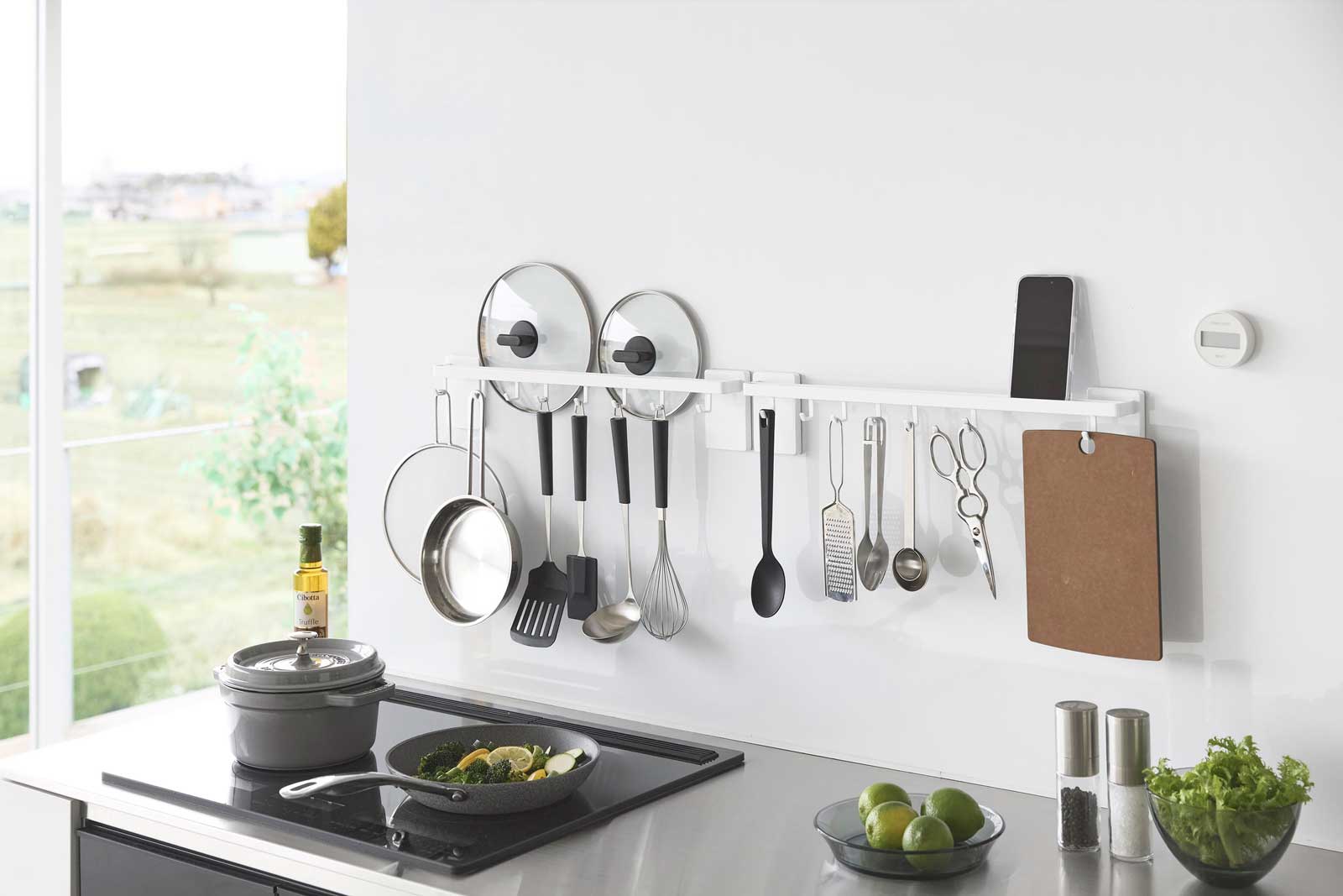 フィルムフックで簡単に取り付けられる、鍋蓋とキッチンツールをまとめて収納できるバーです。鍋蓋が置けるバーの上部には溝があり、スマートフォンを立て掛けられるので、レシピを確認しながら調理できます。8個のスライド式フックでキッチンツールを整理でき、位置も自由に調整可能です。