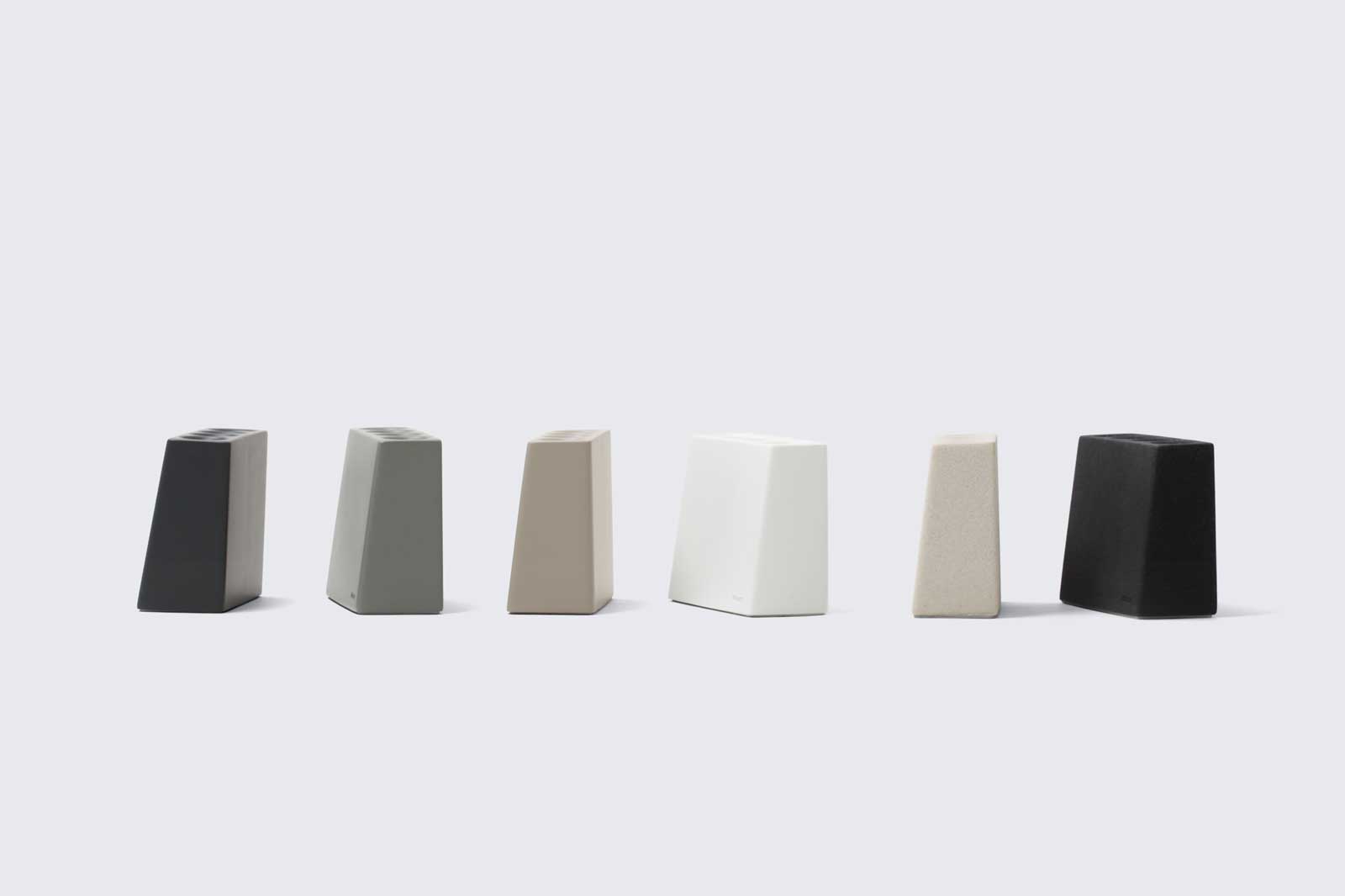 製造時CO2排出ゼロで作れる素材、環境にやさしい「POLYWARE(ポリウェア)」で作られた傘立て。ポリウェアはポリエステル樹脂の2液を混ぜることで30分ほどで固形化する特性を利用し、そこに天然石や炭酸カルシウムのパウダー状の素材を混ぜてあげることで重みのある形状を生み出しています。